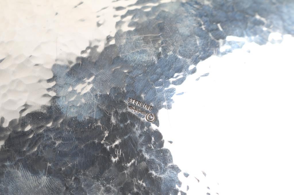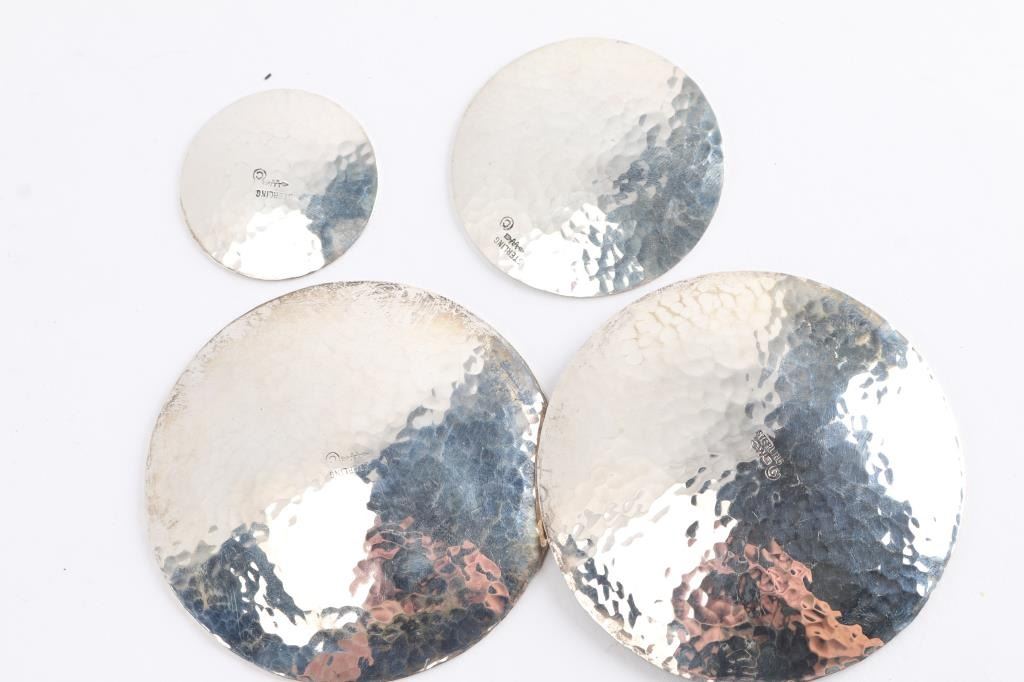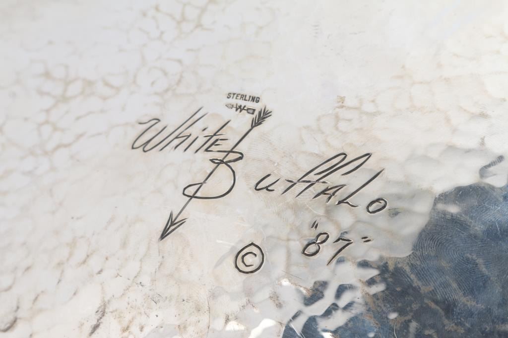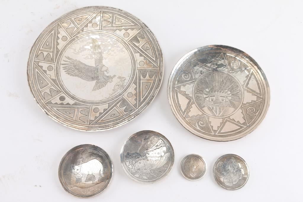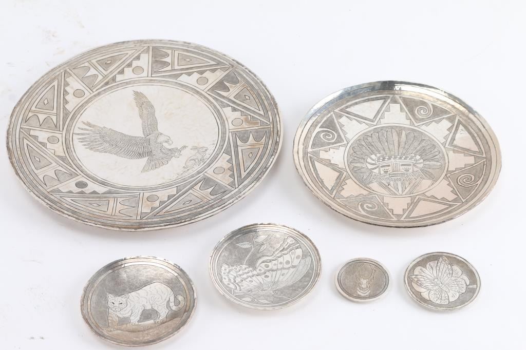 Largest plate has eagle design and is maker marked White Buffalo and dated 1987. 8" in diameter. Second largest has kachina design, maker marked W with arrow, 6" in diameter. Third has a mountain lion motif. Maker marked W with arrow, 3" diameter. Fourth has a butterfly motif maker marked W with arrow, 3" diameter. Next is a 2" diameter butterfly motif, maker marked W with arrow. Smallest has a pronghorn design, maker marked W with arrow, 1" diameter. All excellent condition.