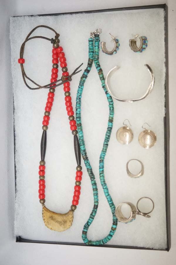 Collection of Sterling Jewelry, Some Native American, includes trade bead necklace, bracelet, Navajo Concho Earrings, Navajo Turquoise Ring, Navajo Mother of Pearl Ring, Asian Turquoise and Lapis Ring and Earrings, Navajo Turquoise Heishi Necklace, longest measures 26'' end to end