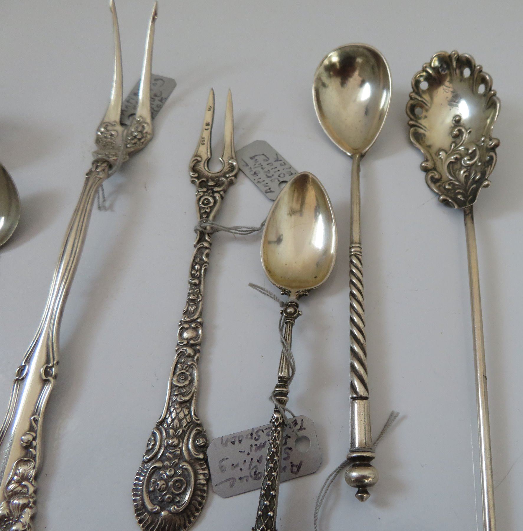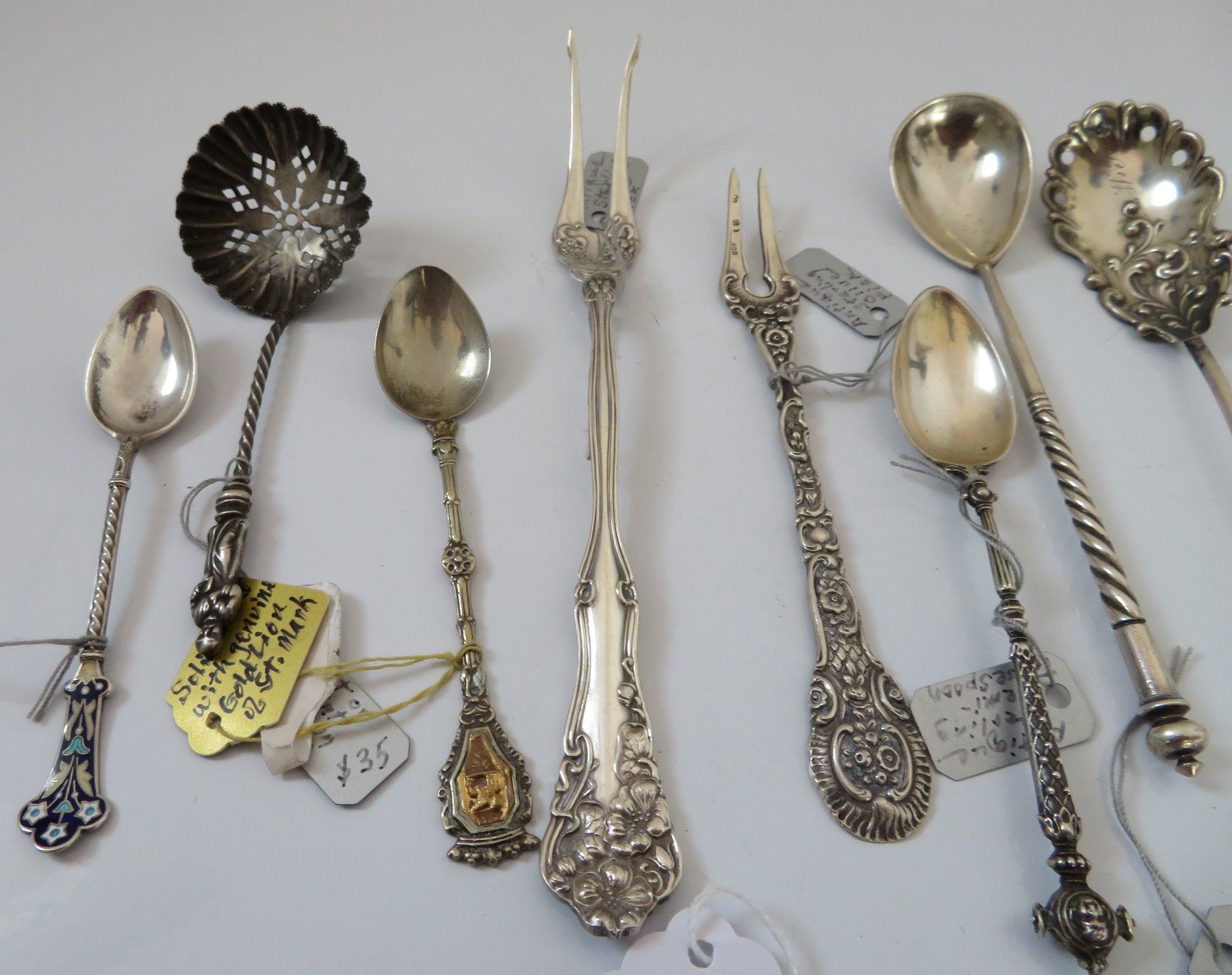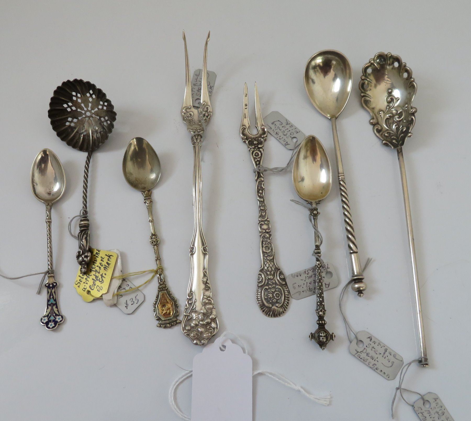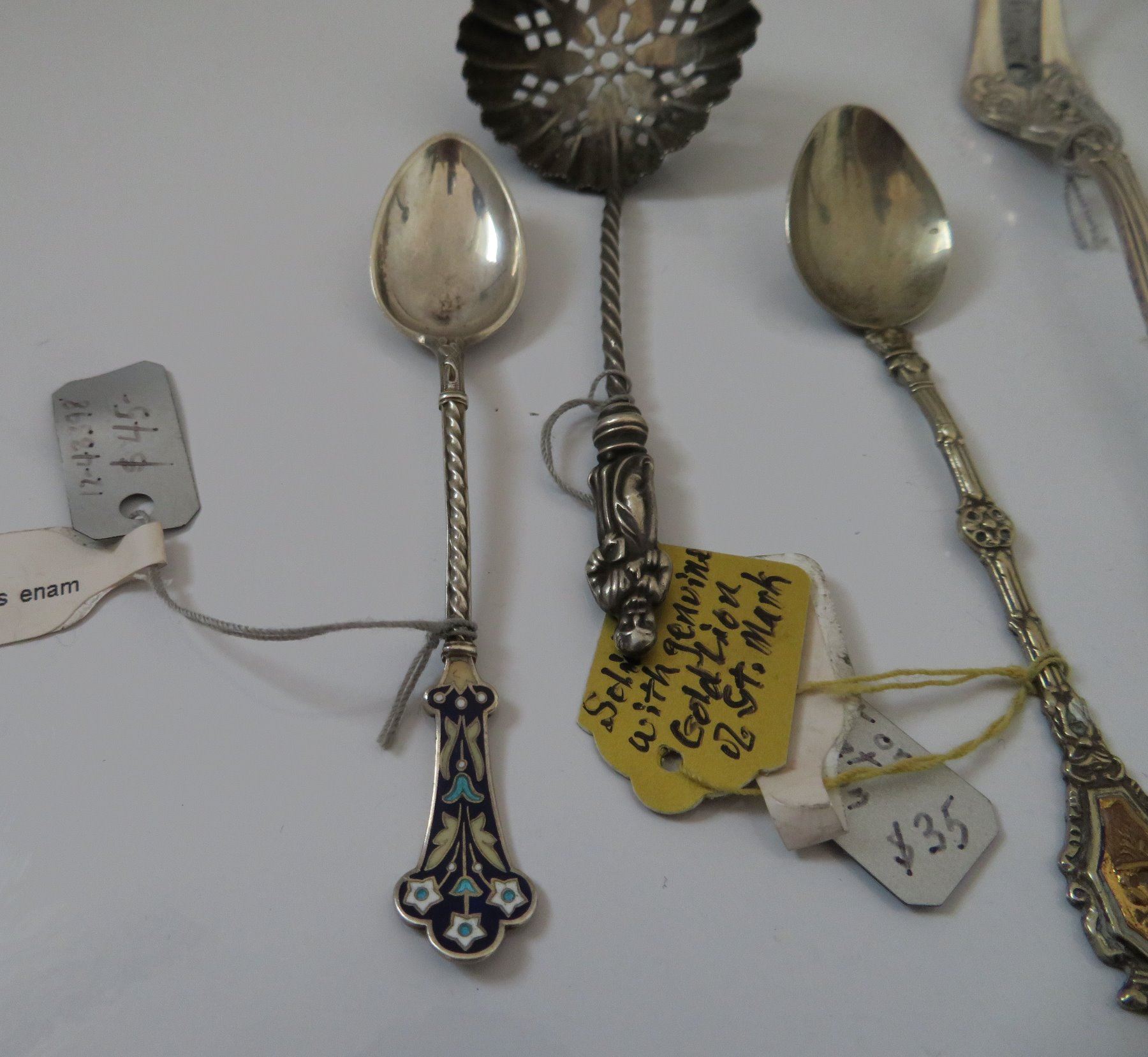 Collection of Sterling Serving Spoons, antique items. Made of sterling silver, gold and enamel, the items are from various regions. Total lot weight is approx. 104 grams. Items measure from 3 3/4" to 6 1/2" long. Condition: Good, see images. Shipping: $20.00 w/insurance and signature.