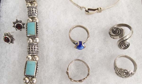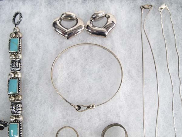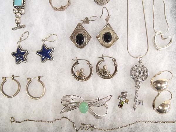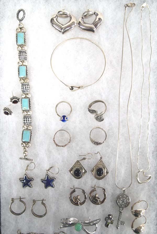 Collection of Sterling Silver Jewelry, includes 2 necklaces, 3 bracelets, 4 rings, 7 pairs of earrings, 1 cross pendant, and 1 pin, some pieces are stamped .925, 123.9g in total wt.