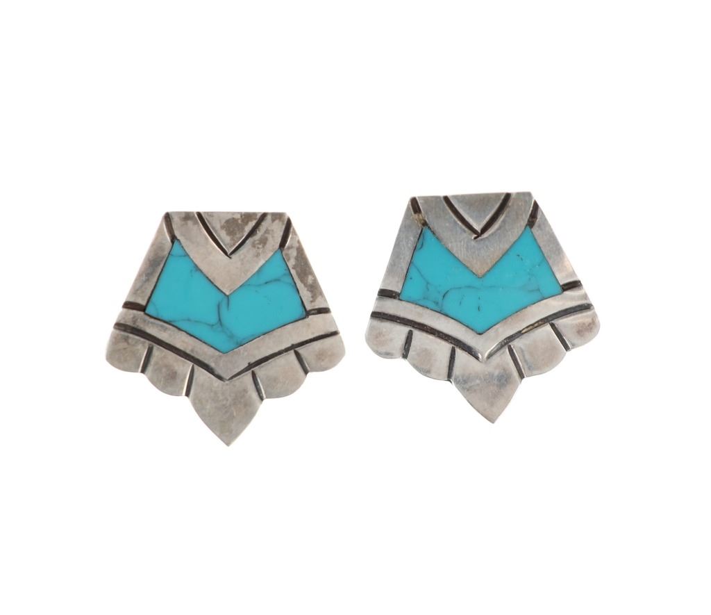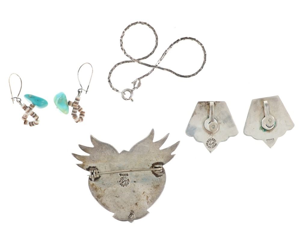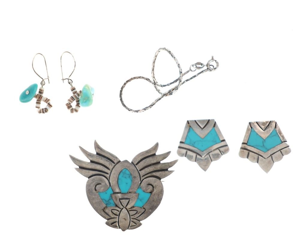 Presented in this lot is a Collection of Sterling Silver and Turquoise Jewelry. First are a pair of Taxco stamped Sterling Silver and Fox Turquoise earrings and a stamped Taxco Sterling Silver and Fox Turquoise Brooch. Both items have an Aztec-style design. Second is a pair of Fox Turquoise and Heishi bead earrings. Lastly, is an Italian Sterling Silver Tennis Bracelet. All three items have beautifully unique designs. Sterling silver items are stamped 92.5. Total weight is 30.6gms.