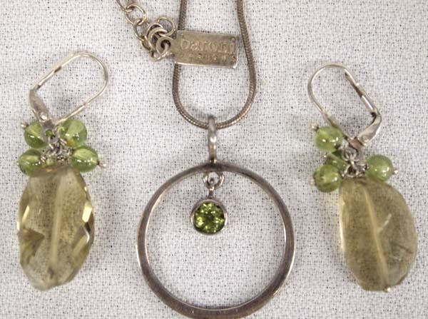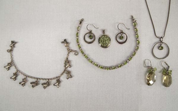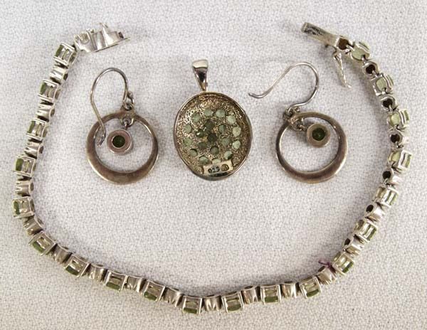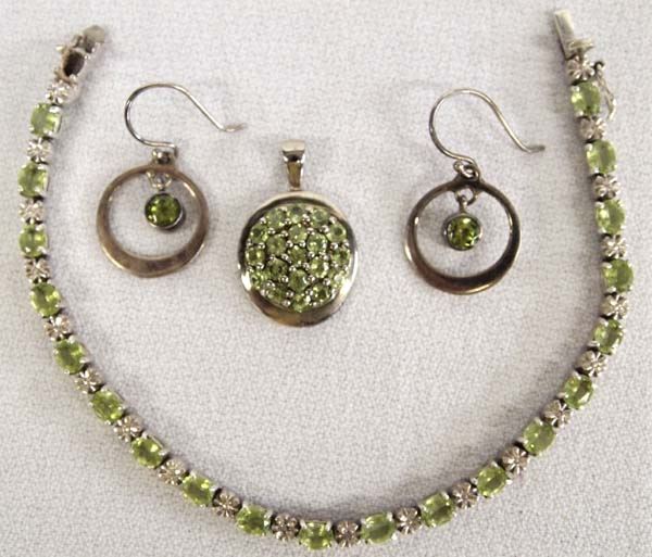 Collection of Sterling Silver and Peridot Jewelry, includes 1 necklace, 2 pairs of earrings, 2 bracelets, and 1 pendant, longest measures 16'' end to end and pendant measures 1''D, 45.07g in total wt., Nice variety in this collection