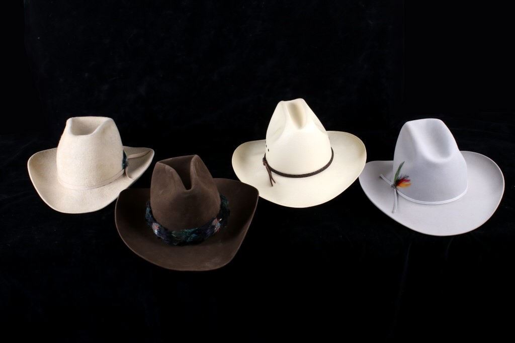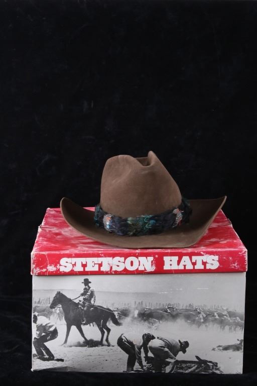 For your consideration this Collection of Stetson & Westerner Cowboy Hats. There are four hats total in this collection, all are in good display condition with one of the felt hats really needing to be re shaped. The first hat is a Stetson 5X Beaver Lt Gray Felt Hat with a light gray hat band. The second hat is a Straw Stetson W8174 Ardmore in its natural color. The hat band is made form two lengths of braided leather with interwoven black and brown leather. The last two hats are Wes Willis edition Westerner Felt hats from Missoula, Mt. Both are a brown one showing an almost cream brown and the other a traditional brown felt hat. The hat band on the traditinoal brown felt hat is made from peacock feathers and is attached with tiny hooks at either end of the hat band. and the other brown felt hat has a slender cream brown hat band with a single peacock feather on its side. The measurements of these hats are 7 1/2, 7 5/8, and the last two are both 7 1/2" custom hats. The measurements of the box with three of the hats in it is 9" x 15 1/2" x 18". The measurements of the second box is 8" x 15" x 17 1/2".