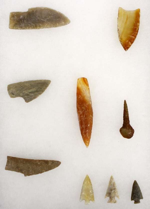 Collection of Stone Arrowheads, age and origin unknown, largest measures 3''L x .5'' and does include a stone drill, 9 total