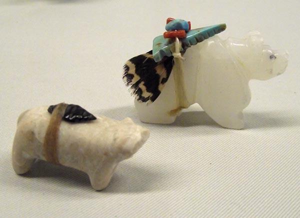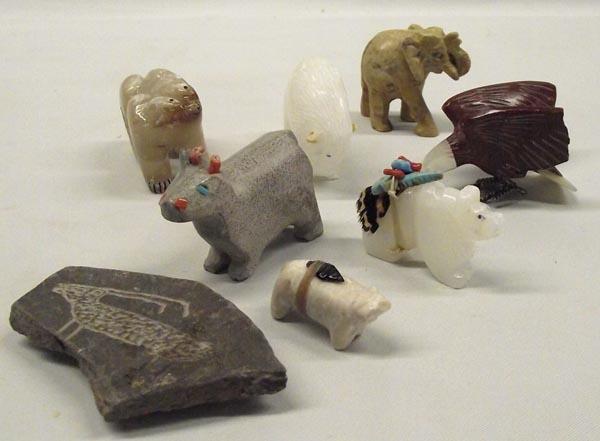 7 Plus Fetishes. 7 misc. fetishes and one engraved stone piece. Some damage to the fetishes, head damage to one bear, coral horns and one ear damage to cow, some horn and face damage to buffalo, eagle wing broken off. Largest measures approx. 2 1/2'' x 1 3/4''. Buyers Pay Actual Shipping and Handling Charges(see terms and conditions for more information).