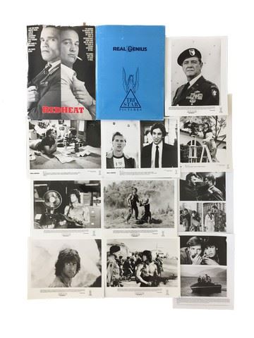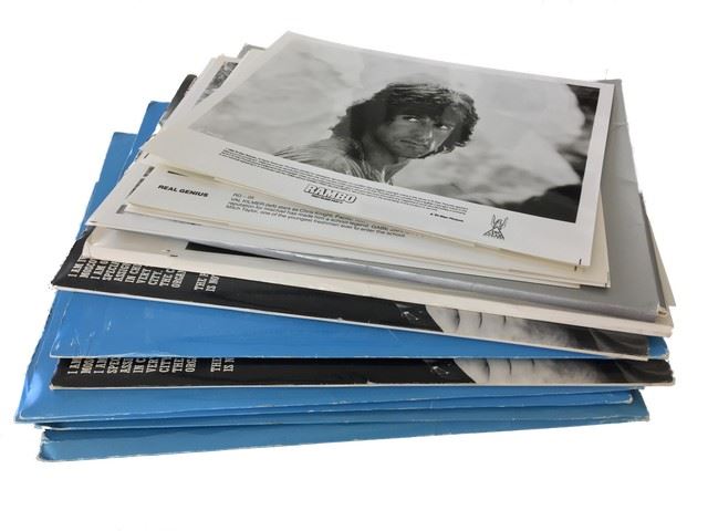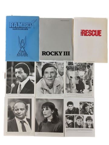 Collection of 5 press kits from Tri-Star, Touchstone and United Artists (circa 1980's-90's) with ~75 publicity stills, mainly 8"x10". Includes press kit for "Rambo First Blood Part ll (1985), starring Sylvester Stallone as John Rambo and Martin Kove as Ericson. This sequel picks up with Rambo in jail and excepting a plea deal to help rescue American POW's in Vietnam. Also includes the press kit for "Real Genius" (1985), starring Val Kilmer as Chris Knight, and Gabriel Jarret as Mitch Taylor, "Red Heat" (1988) with an all star cast of Arnold Schwarzenegger as Ivan Danko, Jim Belushi as Art Ridzic and Gina Gershon as Cat Manzetti, and "The Rescue" (1988), starring Edward Albert as Commander Merrill, Ellen Barber as Virginia Phillips, and Timothy Carhart as Lt. Phillips. A group of kids venture into enemy territory to rescue their Navy Seal dads. Also includes press kits for "Rocky lll" (1982). This iconic films that set Sylvester Stallone up for stardom, stars Sylvester Stallone as Rocky Balboa and Carl Weathers as Apollo Creed, and Mr. T as Clubber Lang.