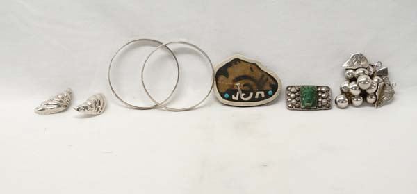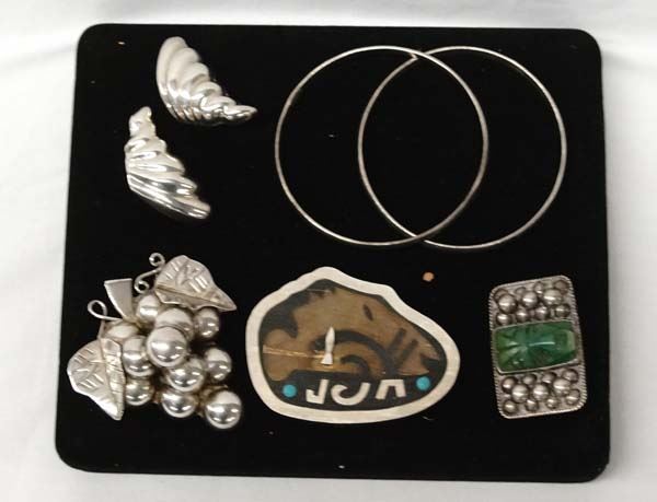 Collection of Taxco Jewelry, largest is grape cluster pin measuring 2.5''L x 2.25''W, includes 2 bangle bracelets, 3 pins, and 1 pair of clip on earrings, nice collection, 148g in total wt.