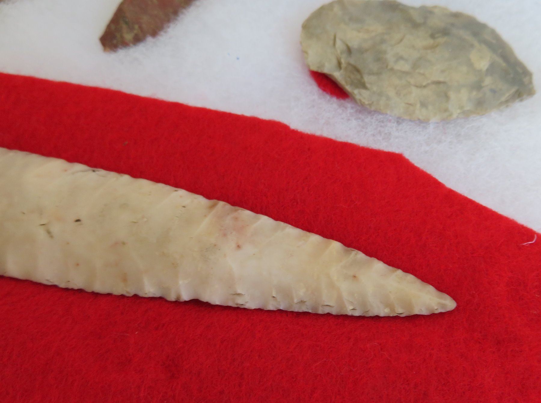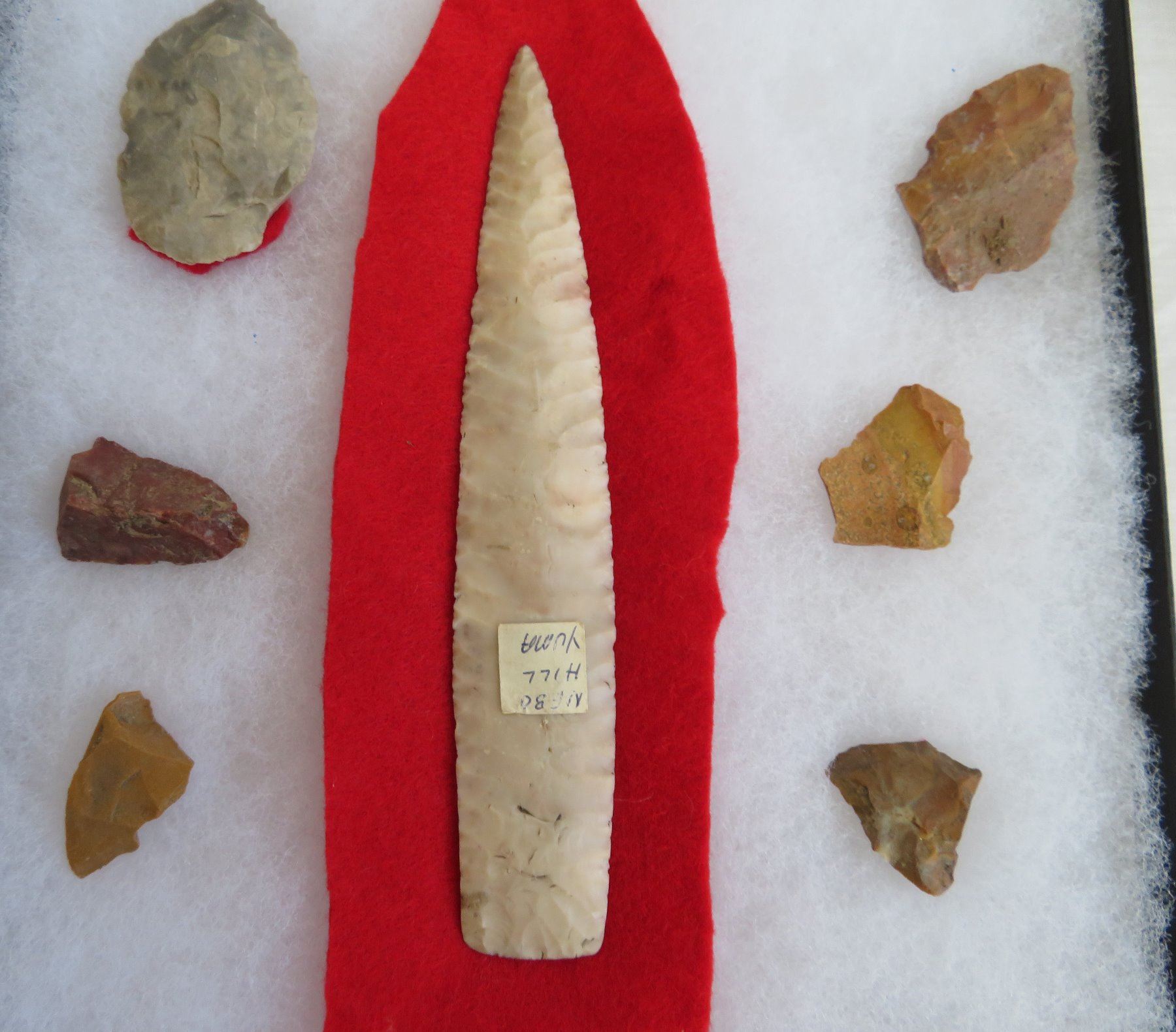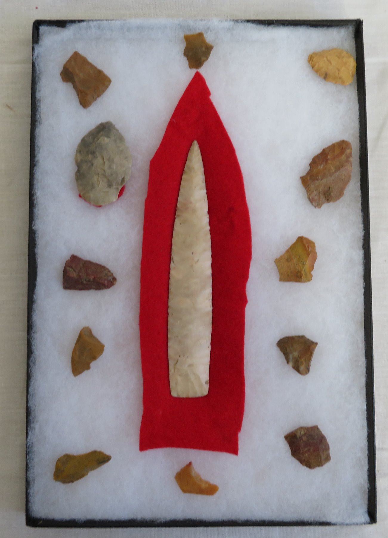Collection of Texas Artifacts, paleo to historic periods. Made of chert, the longest item measures 6 1/4". Bell County, Texas. Yuma-type chipping on center piece. Frame not included. Condition: As found, see images. Shipping: $18.50 w/insurance and signature.
