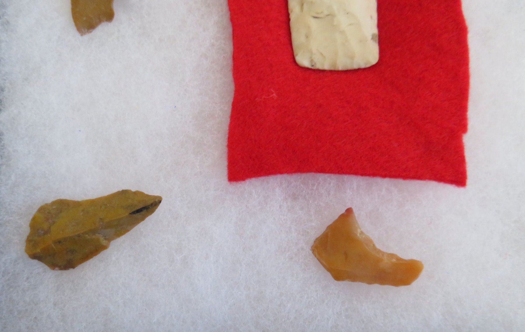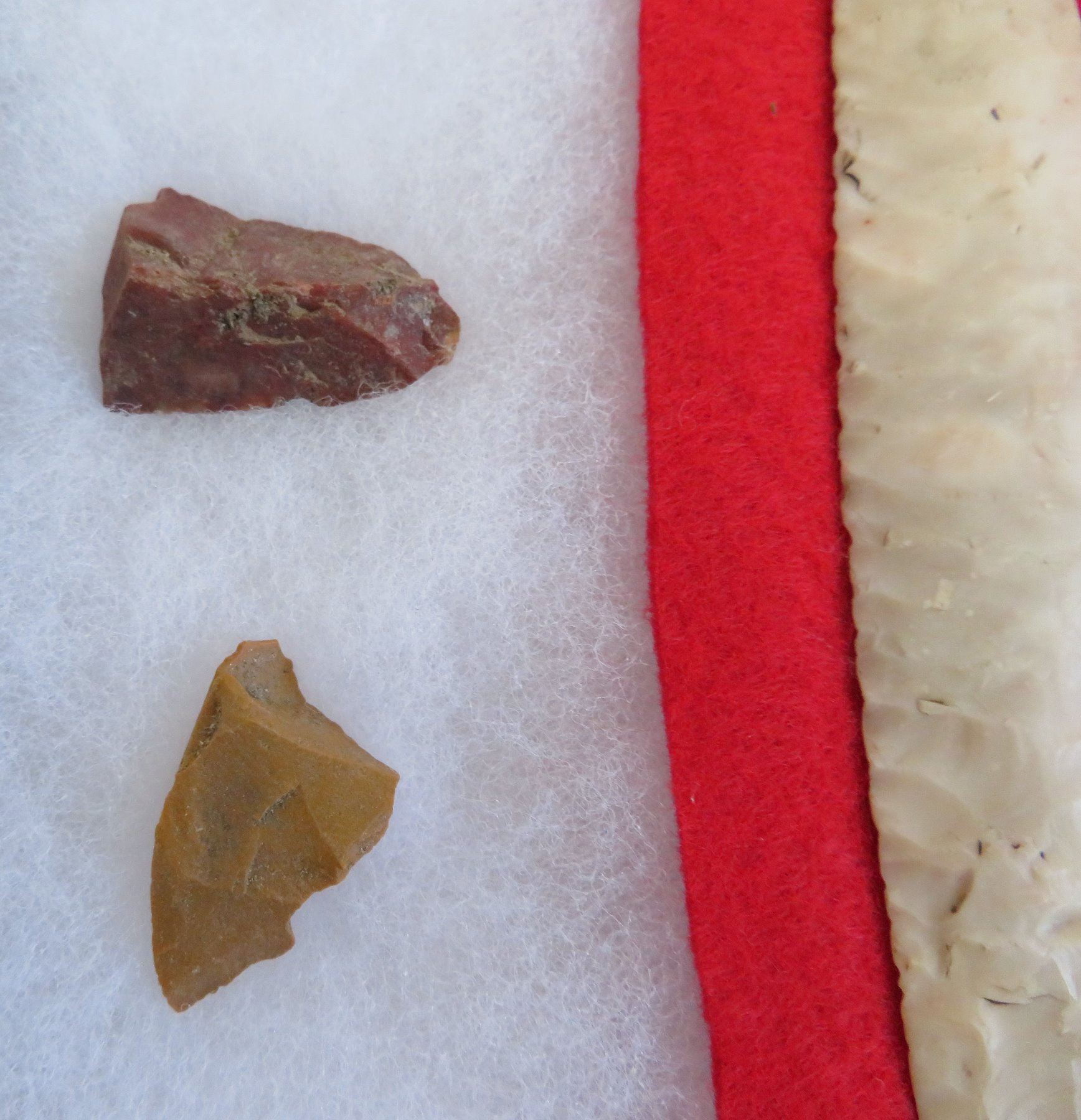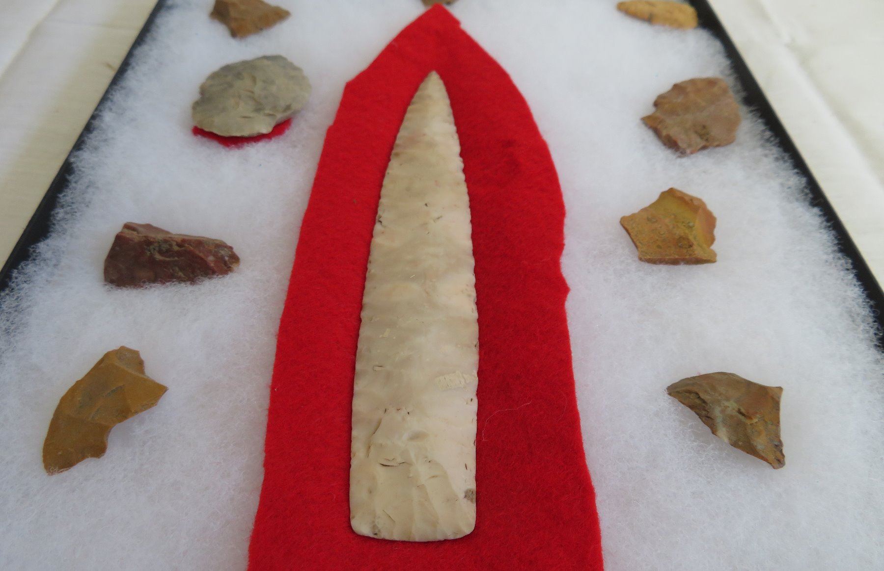 Collection of Texas Artifacts, paleo to historic periods. Made of chert, the longest item measures 6 1/4". Bell County, Texas. Yuma-type chipping on center piece. Frame not included. Condition: As found, see images. Shipping: $18.50 w/insurance and signature.