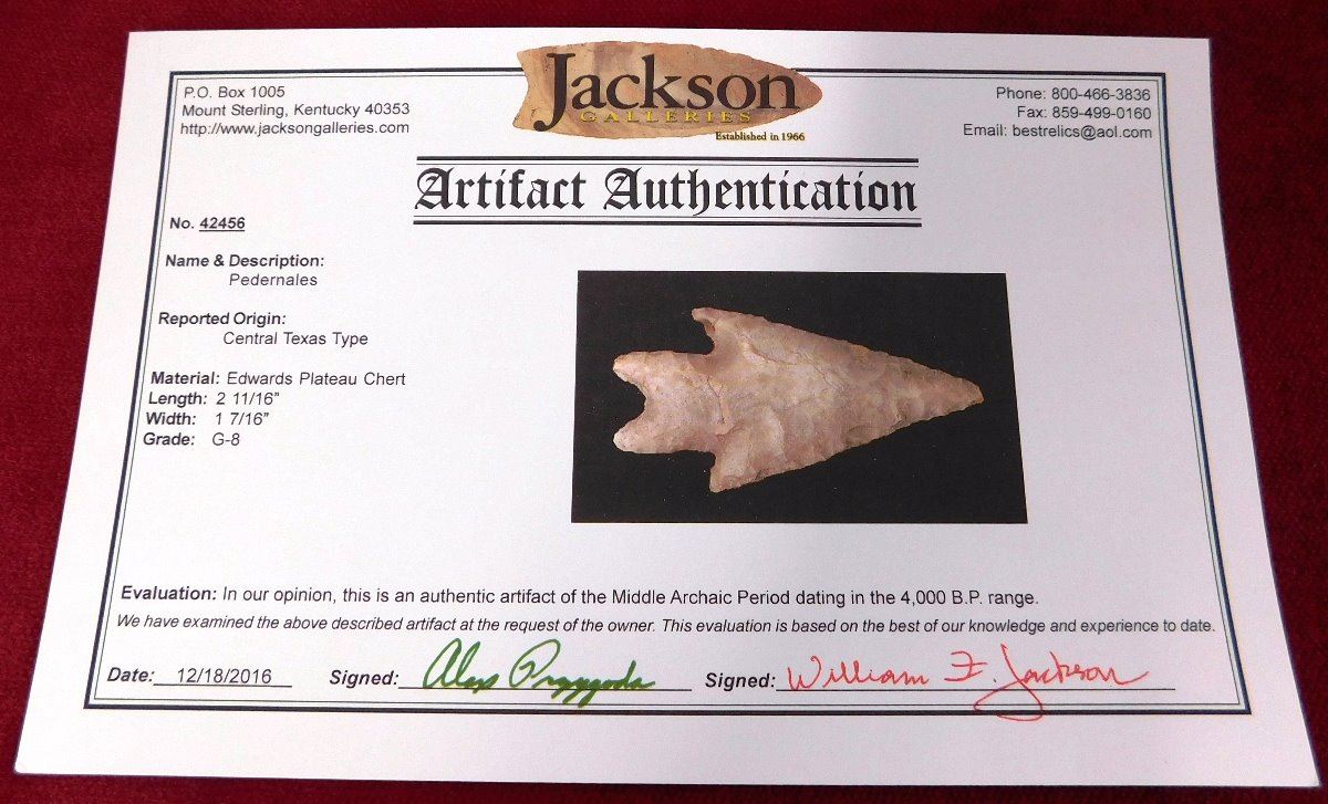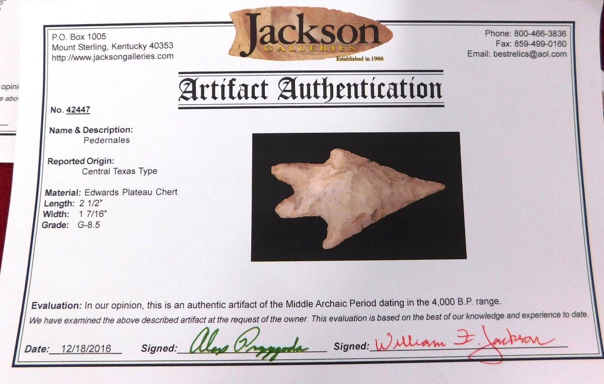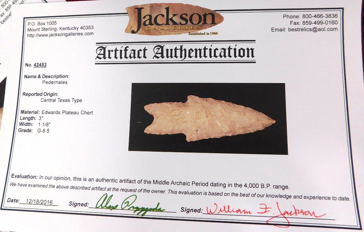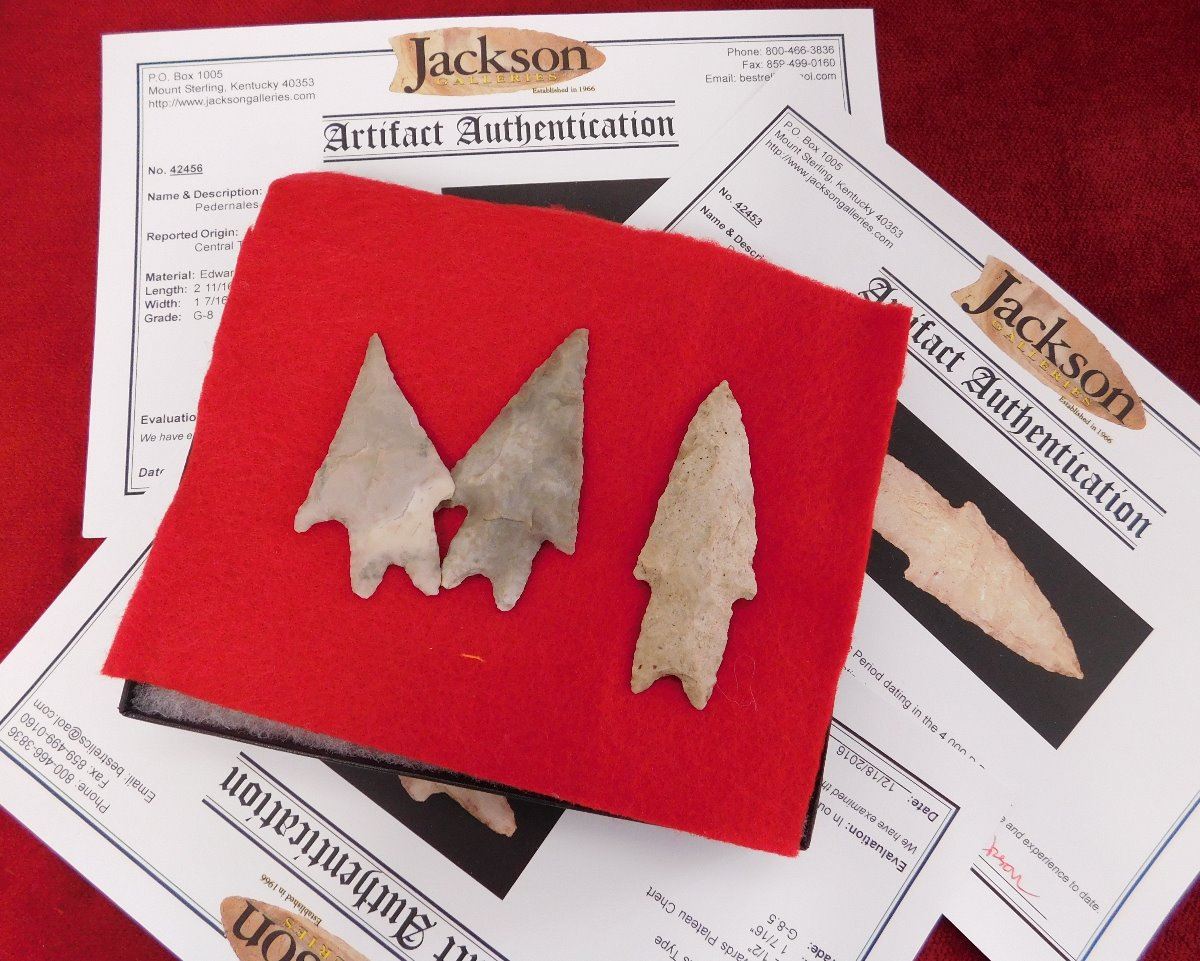 Collection of Texas Points w/Jackson COAs, circa 4000 yrs B.P. Made of chert, the items are 2.5" to 3" each. Central Texas. Nice collection of classic Texas points. Frame not included. Condition: Grades 8.5 and 8, see images. Shipping: $16.50 w/insurance and signature.
