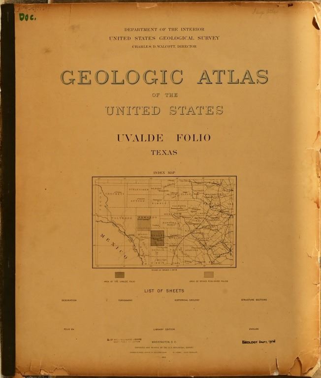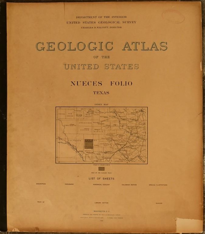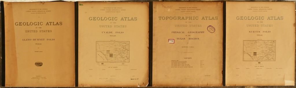 Four Texas Folio Volumes from the Topographic Atlas of the United States. Published in Washington, D.C., 1898-1912, by the U.S. Geological Survey. Each is 21-3/4” x 18-1/2” and contains numerous landscape photographs and topographic maps. The Volumes are: Physical Geography of the Texas Region. 1900. Nueces Folio, Texas. 1898. Uvalde Folio, Texas. 1900.; and Llano-Burnett Folio, Texas. 1912.