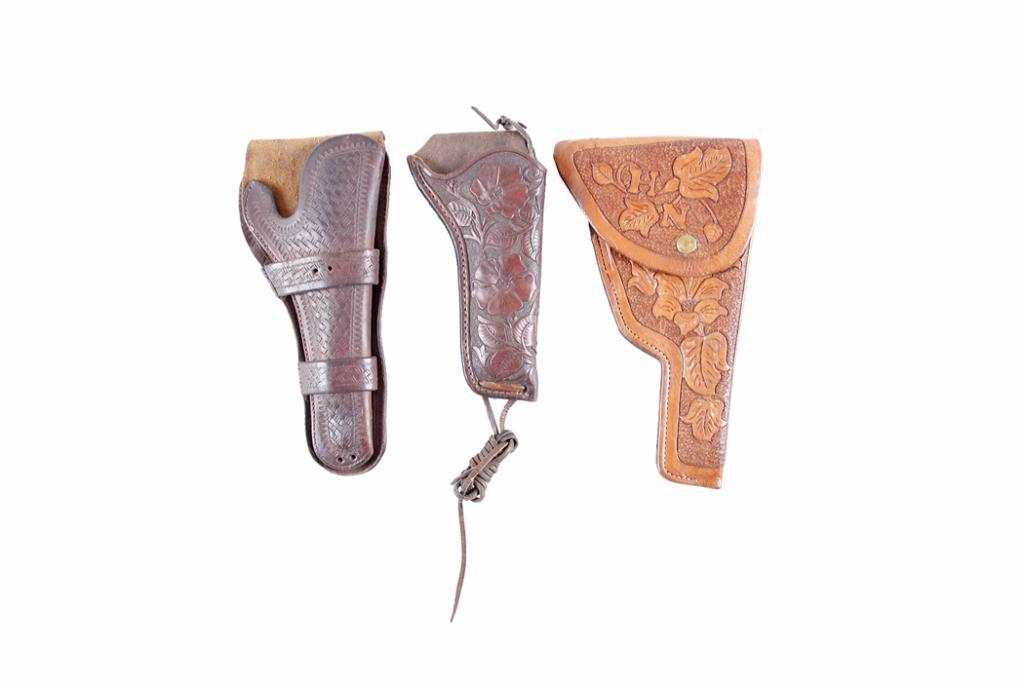 Collection of Three Leather Holsters Including a hand tooled leather flap holster initialed HN; a hand tooled holster made by W K D with floral design; and an early hand tooled leather pad reinforced revolver holster.Including a hand tooled leather flap holster initialed HN; a hand tooled holster made by W K D with floral design; and an early hand tooled leather pad reinforced revolver holster.