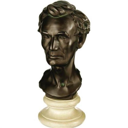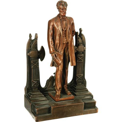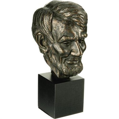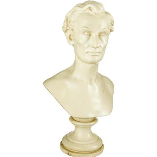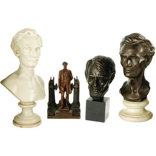 <B>Collection of Three Lincoln Busts & One Statue.</B></I> 1.) Plaster one-piece Lincoln bust measures approximately 7.25" wide at its widest point x 4.5" deep x 11" tall. No artist or maker's mark indicated. Felt affixed to bottom of base. Plaster chipping throughout, especially to the mouth, nose, and left eye. Several cracks to the back of the piece are not noticeable from the front, and do not affect the integrity of the bust. 2.) Bronze Lincoln bust mounted on ceramic base measures 5" wide at its widest point x 5" deep x 13" tall. "Abraham Lincoln Modelled from Life by Leonard W. Volk Chicago, 1860 Replica" can be read on the back of the bust. Felt affixed to bottom of base. Largely free of patination. Handsome piece. 3.) Black plaster Lincoln bust on black wood base measures 4.5" wide at its widest point x 5.25" deep x 10.25" tall. "Heilborn (?) 56" signed into the back of the neck along with "© MPI". A few small nicks do not take away from this appealing Lincoln bust. 4.) Small Lincoln Statue measures 5.25" wide x 3" deep x 9" tall. Lincoln figure is copper-colored, while the base around him is darker brown. Felt affixed to the bottom of the base. Lincoln stands affixed to the base with one hand behind his back, and the other clutching a document, possibly the Gettysburg Address or his Second Inaugural. Axe-topped columns frame Lincoln, and an American bald eagle stands behind the embattled president. A few small scratches on the front of the base and general age wear do not detract from the overall appeal of this truly powerful image of Honest Abe.<BR><BR><b>Shipping:</b> Miscellaneous Collectibles, Larg (<a target="_blank" href="http://www.heritageauctions.com/common/shipping.php">view shipping information</a>)