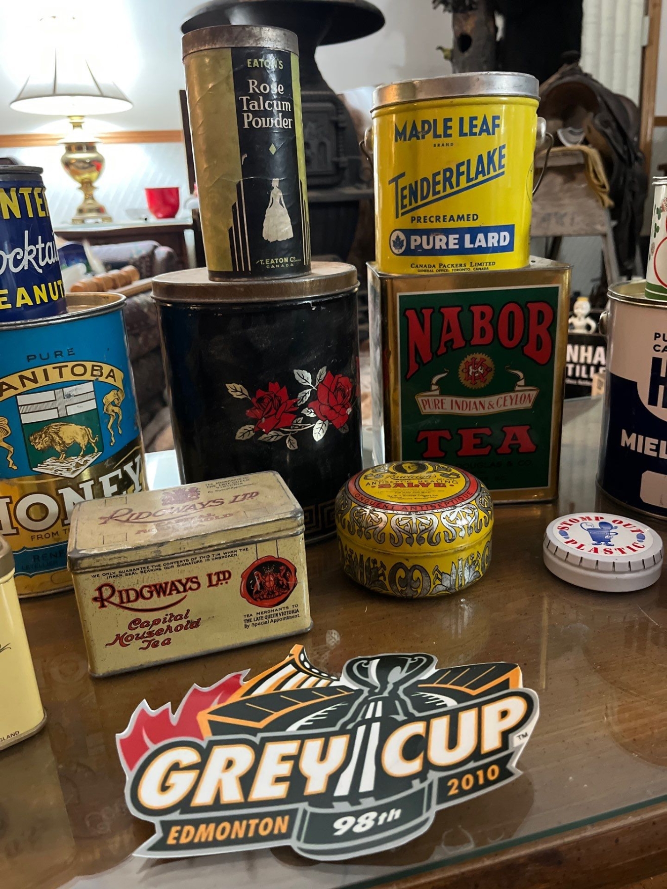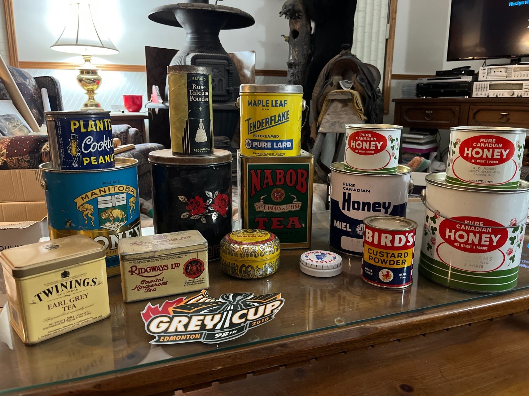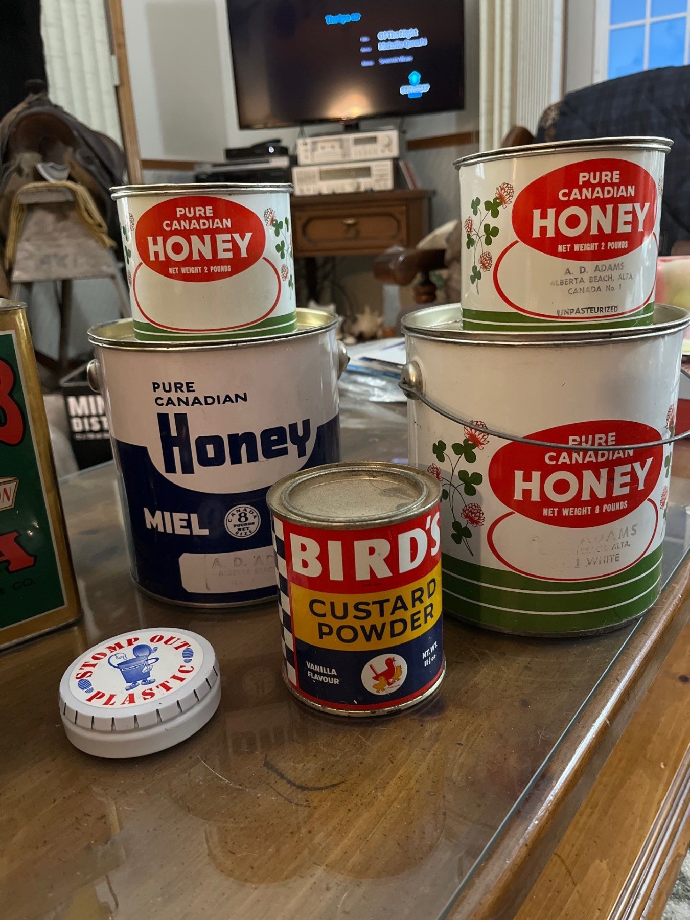 Collection of Tins pure Canadian honey, birds custard powder, nabob tea, maple leaf tender flake pu