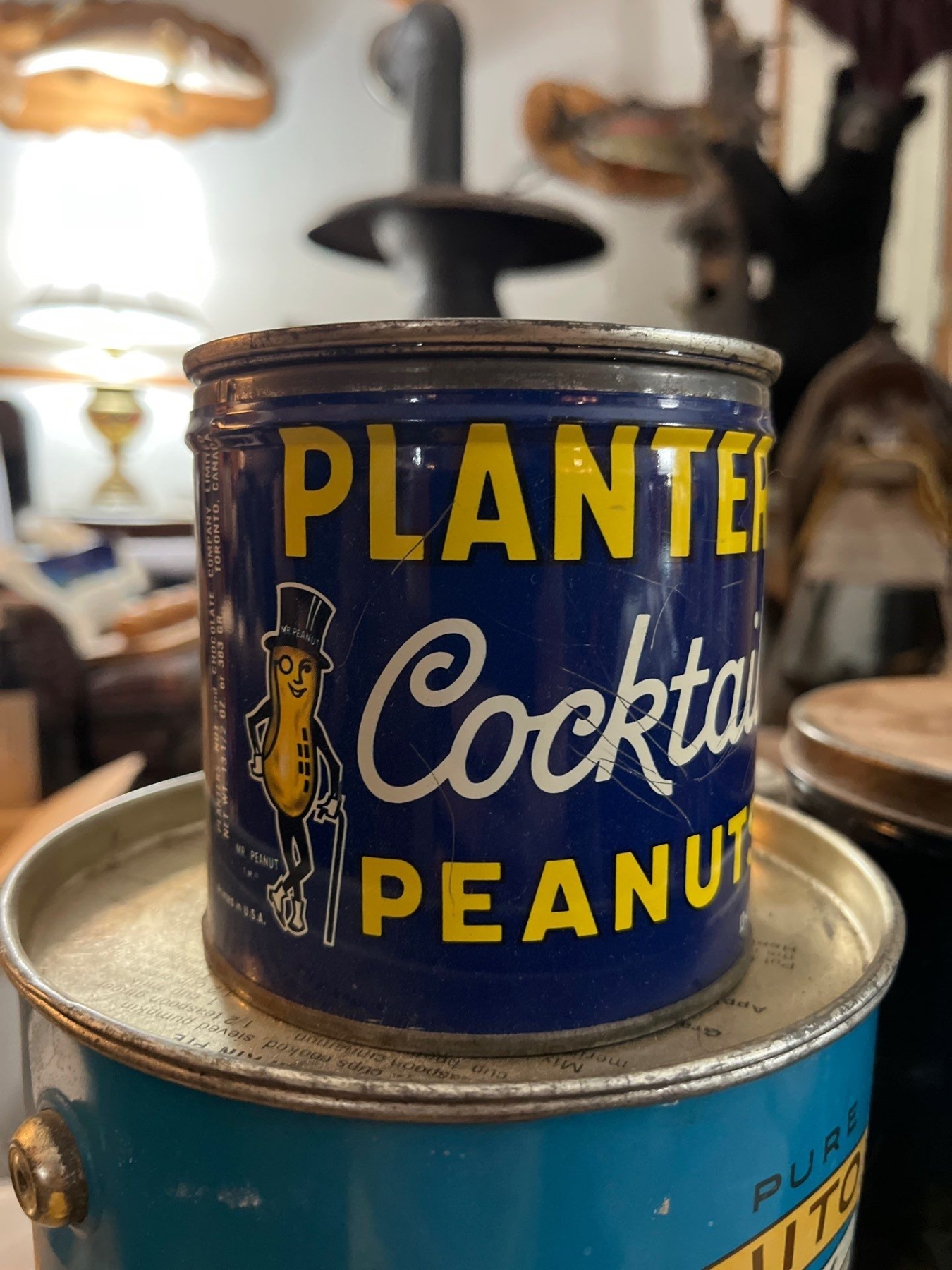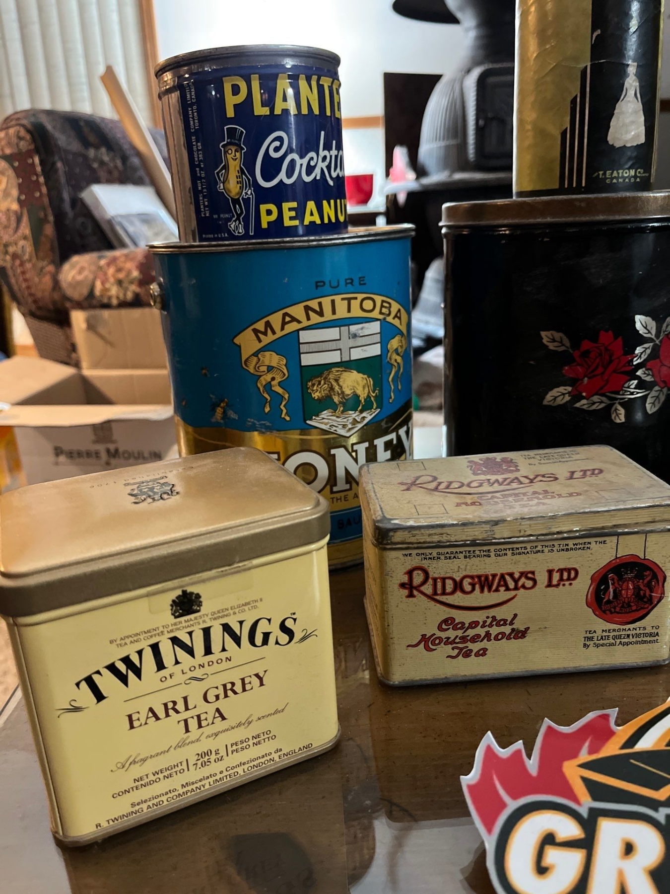 Collection of Tins pure Canadian honey, birds custard powder, nabob tea, maple leaf tender flake pure lard planters cocktail peanuts, and more