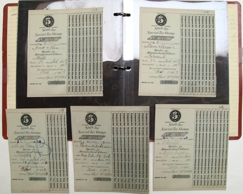 This is a very unique group of receipts for Dakota Territory just dealing with tobacco merchants. With a total of 34 stubs and 1 tax collector checklist signed by John Pennington. Pennington’s collector stamp mark appears on all the stubs. All the stubs were issued between March 1, 1883 to March 28, 1883 and have very little wear.