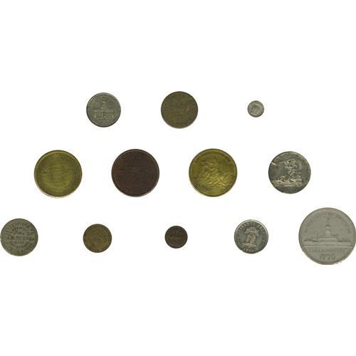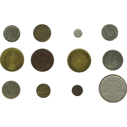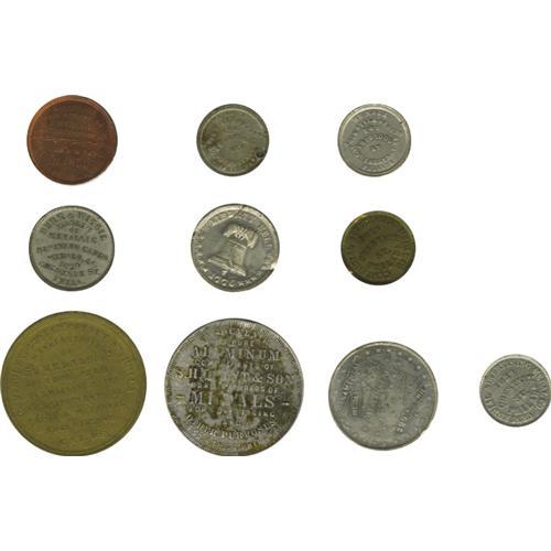 <B>Collection of Tokens Issued by Philadelphia Die Sinkers and Token Manufacturers.</B></I> James A. Allen die sinker, circa 1900, very rare (brass, VF); Burr & Witsil Token Manufacturer, part of 1876 Centennial Series (3 varieties, all white metal, Liberty Bell, Carpenter's Hall, Independence Hall, AU); Centennial Advertising Medal Co., Washington portrait (2 - white metal, brass, UNC). 2 similar pieces without issuer's name but the same address, both with Masonic Hall and Independence Hall (VF, holed); J.H. Diehl / W.H. Key jointly issued token (copper, red UNC); Key Die Sinkers, white metal (2 -Victoria and Albert UNC, Cupid and Dolphin, AU); Lingg & Co., white metal, Liberty Bell, 1876, (UNC); Robert Lovett Jr. Die sinker (5 -Saint George and the Dragon, copper, UNC); Confederate cent prototype, copper-nickel (XF); George Washington on horseback, brass (UNC); Stephen Girard, copper (UNC), brass (UNC); S.H. Quint and Sons, aluminum, tiny (XF); Columbian Expo (VF, pest); George B. Soley, 1876, compressed fiber (2 silver color picturing Independence Hall, gold color picturing U.S. Grant.) Both of the very rare and Uncirculated; S.W. Reese - A New York City based die sinker - issued this token at a veterans reunion at Gettysburg, September 2 and 3, 1890. (Silvered brass, VF). 22 pieces
