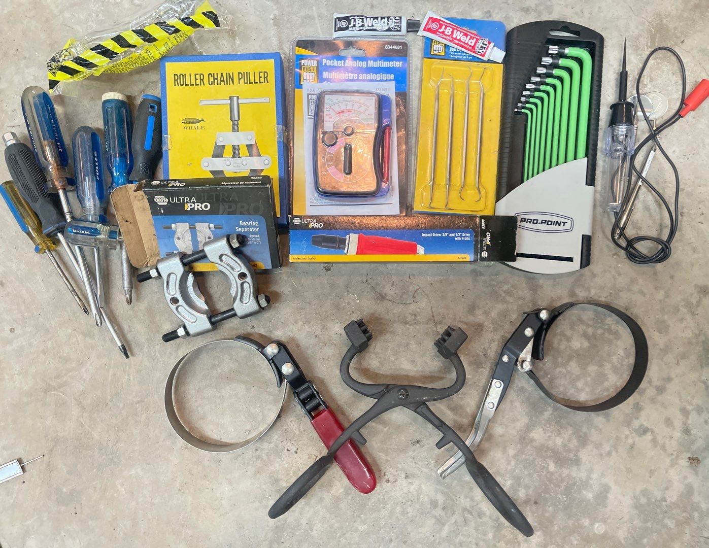 Collection of Tools- Roller Chain Puller, Multimeter, Hex Keys, Screwdrivers & Various Pliers