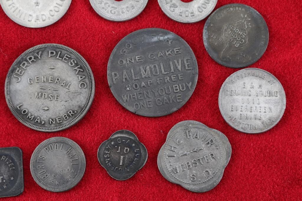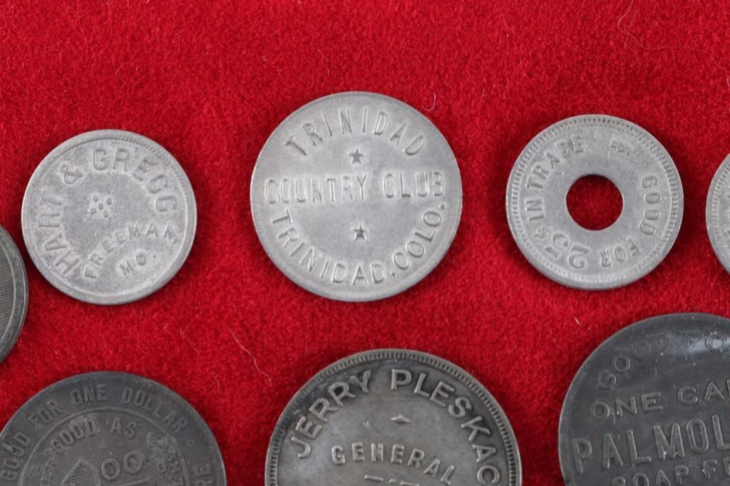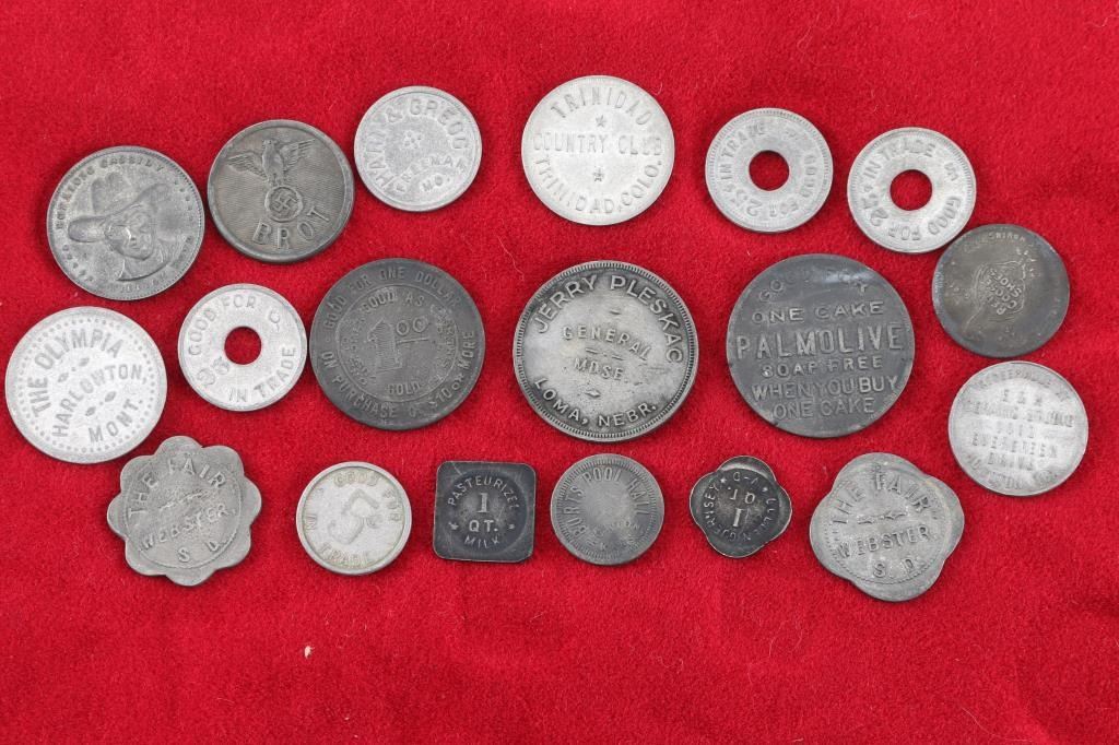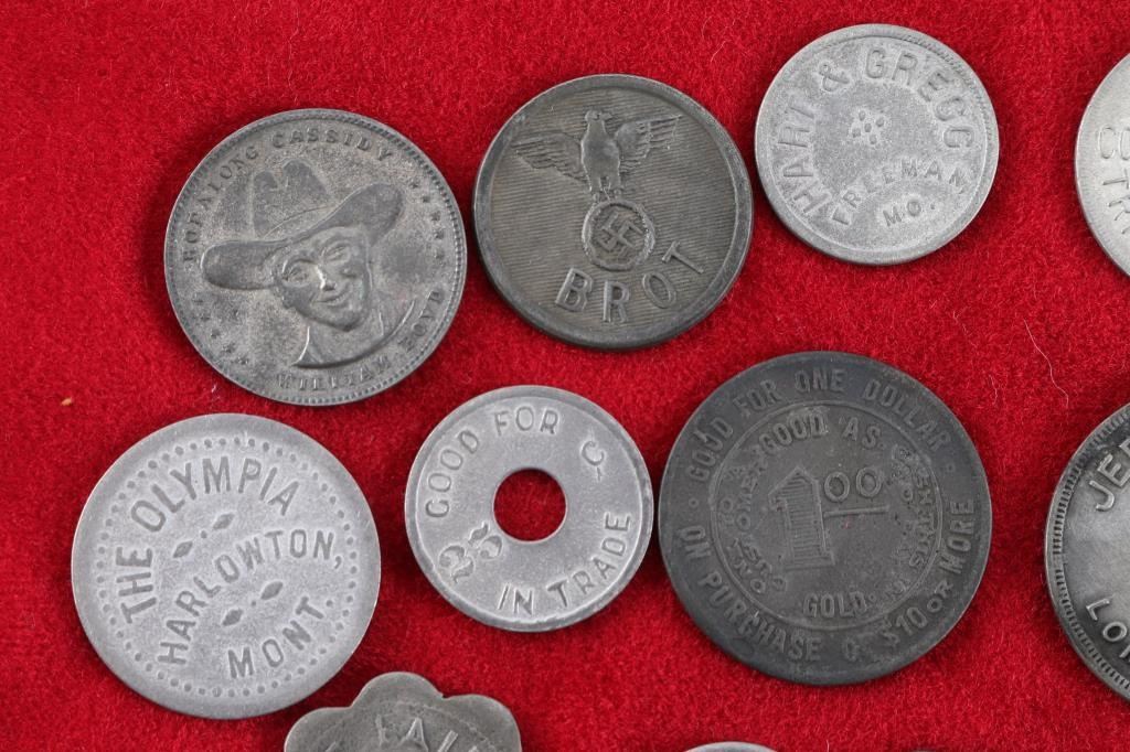 including Palmolive, Trinidad Country Club, Hopalong Cassidy Coin,Hart & Greg Coin, The Fair, E&M Ceramics, and a NAZI Brad Token.