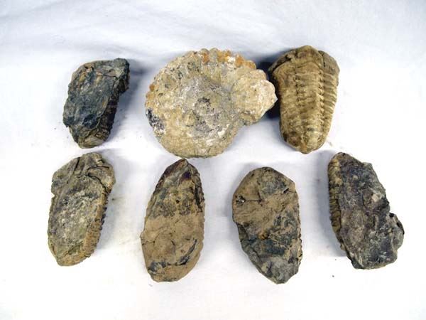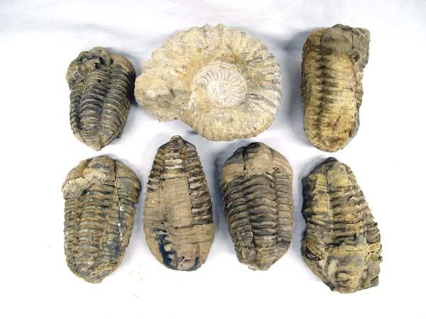 Collection of Trilobite and Ammonite Fossils, includes 1 natural ammonite and 6 trilobites, largest measures 3'' x 4''