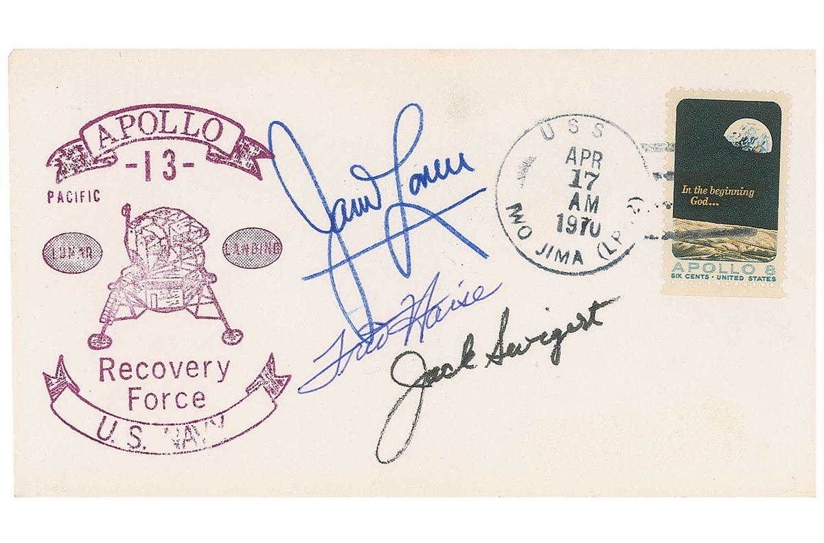 Two Apollo 13 items: an official color NASA 8.25 x 11 lithograph of the Apollo 13 rollout at Kennedy Space Center, signed and inscribed in black ink, “To Kenneth Havekotte, Best Wishes, Jack Swigert”; and an Apollo 13 launch day postal cover with a stamped cachet honoring the US Navy Recovery Force signed in various ink types by James Lovell, Fred Haise, and Jack Swigert. Trivial scattered surface creasing and irregular ink adhesion to the inscription and signature on the photo, otherwise overall fine condition.