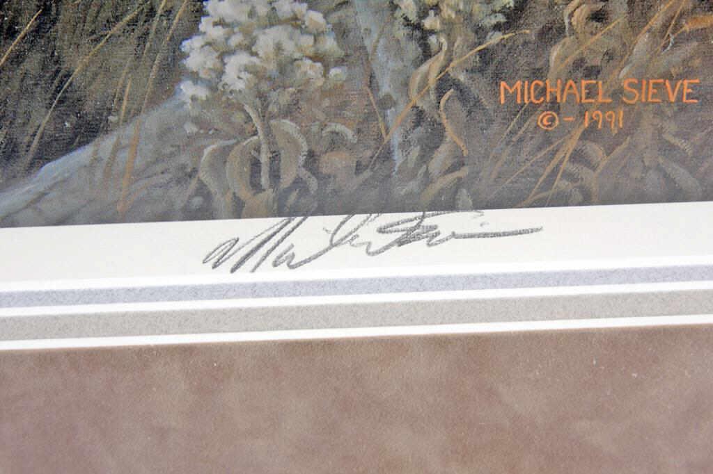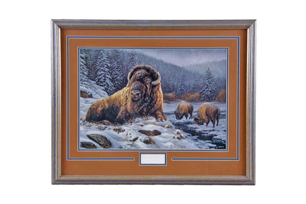 Collection of Two Fine Art Prints One by Rosemary Millette entitled "Spirit of the Wild Bison", double matted and framed, image size is 20"x14"; and a Michael Seize hand signed lower left hand corner, triple matted and framed including a certificateOne by Rosemary Millette entitled "Spirit of the Wild Bison", double matted and framed, image size is 20"x14"; and a Michael Seize hand signed lower left hand corner, triple matted and framed including a certificate of authenticity on back,image size is 27"x18".