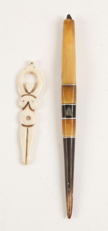 Collection of Two Items Including an antique fountain pen with what appears to be silver inlaid designs (some are missing) and a bone fertility pendant. TO BE SOLD ONLY IN THE STATE OF ARIZONA BY LAW AN COMMERCE.Including an antique fountain pen with what appears to be silver inlaid designs (some are missing) and a bone fertility pendant. TO BE SOLD ONLY IN THE STATE OF ARIZONA BY LAW AN COMMERCE.