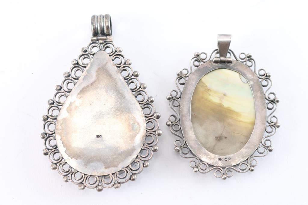 a) hand-painted on shell, the Virgin Mary on beautiful sterling Pendant, marked 950. b) hand-painted shell pendant depicting Jesus Christ, set in sterling silver, marked CP. Total weight with shells is 65 grams.