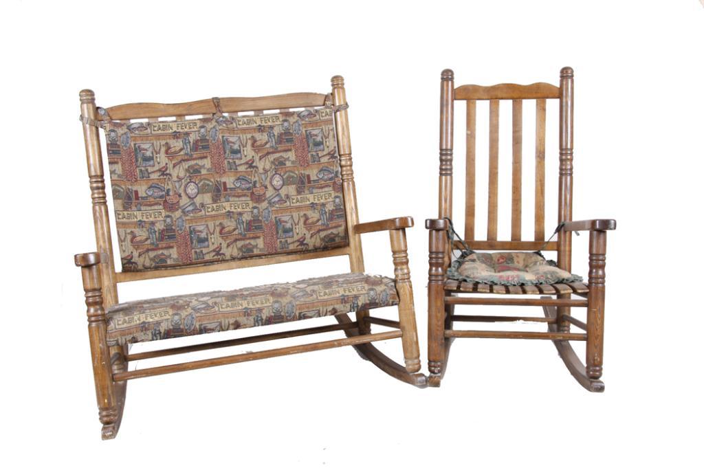 Collection of Two Oak Rockers One nice double porch rocker chair and one single rocking chair.One nice double porch rocker chair and one single rocking chair.