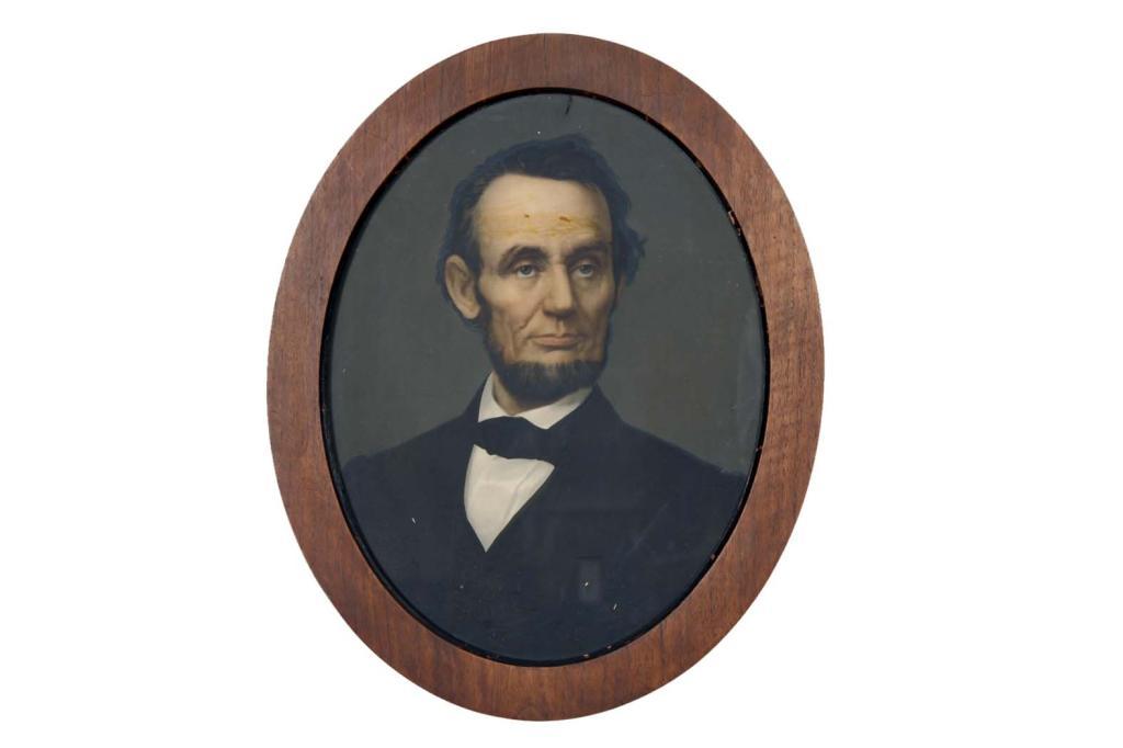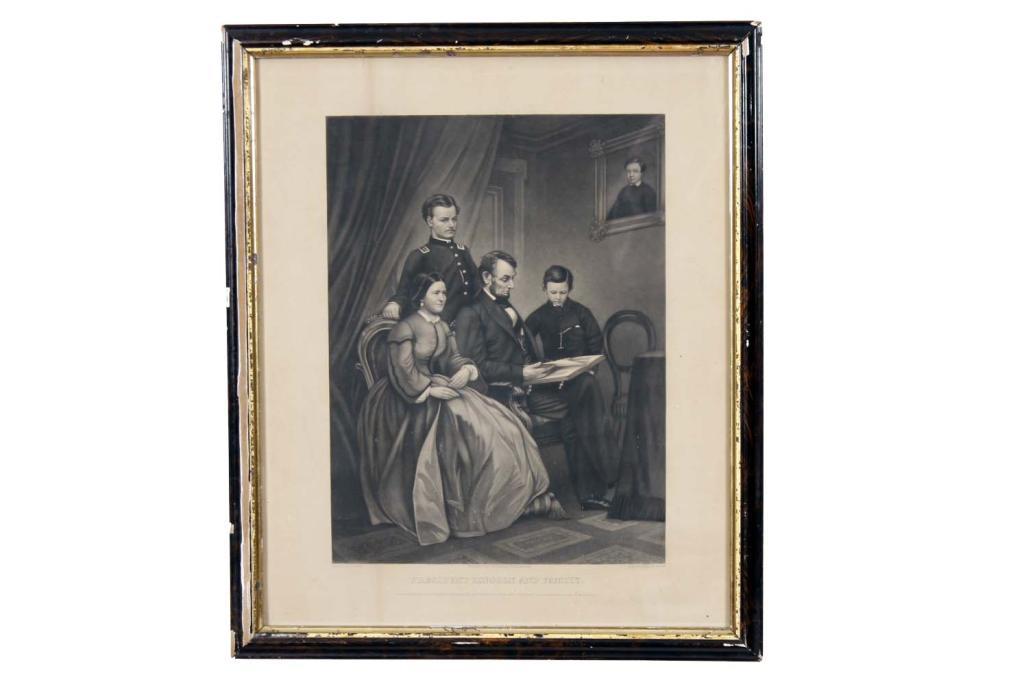 Collection of Two Prints Including a portrait of Abraham Lincoln with letter on the back, in oval frame 10" diameter. Also a copy of a old engraving of President Lincoln and family. 13.5" X 16.5".Including a portrait of Abraham Lincoln with letter on the back, in oval frame 10" diameter. Also a copy of a old engraving of President Lincoln and family. 13.5" X 16.5".