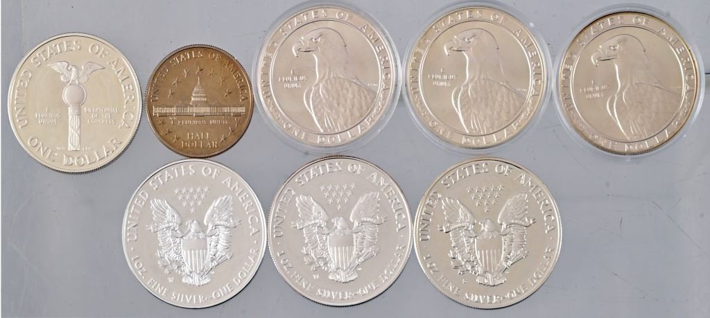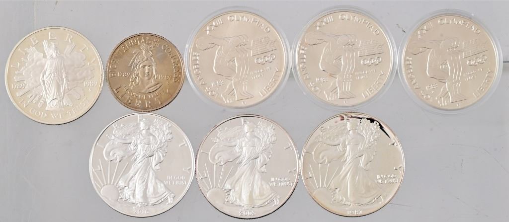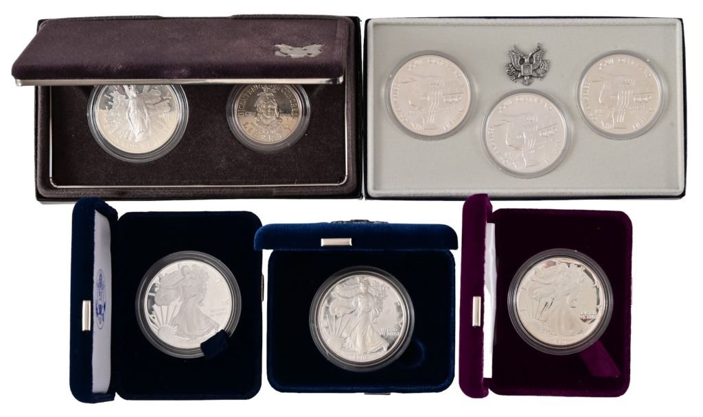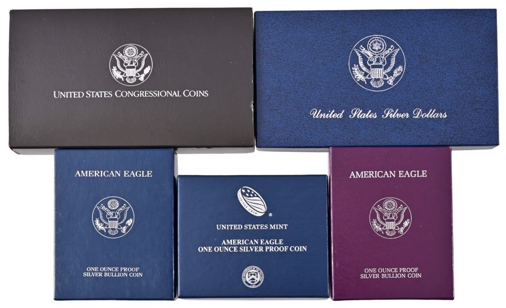 US Mint 1983 Olympiad Silver Proof Coin set, 1789-1989 US Mint Congressional Silver Coin Proof set. 1987 American Eagle Silver $1 One Ounce Proof Coin, 2016 American Eagle Silver $1 One Ounce Proof Coin (30th Anniversary), 2003 American Eagle Silver $1 One Ounce Proof Coin
