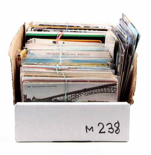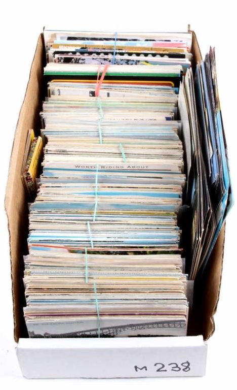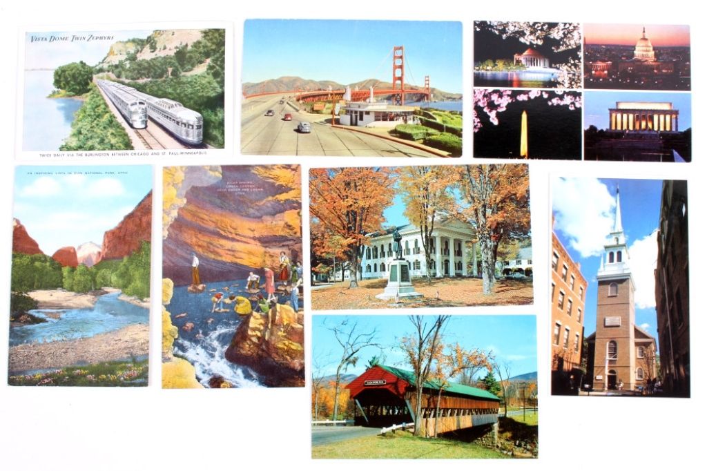 This is a thorough collection of United States post cards covering states such as Vermont, New Hampshire, Illinois, Minnesota and Utah. The cards range over many years from the 50's to today. The collection ofpost cards includes 1,035 cards. Measures 15.75"x7"x4.5".