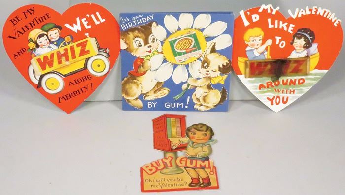 Collection of Valentines and "By Gum" Cards. Including (2) Whiz Gum valentine cards and Varsity Gum birthday card.
