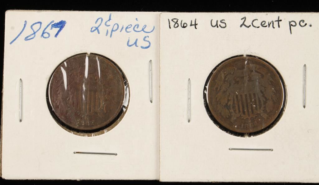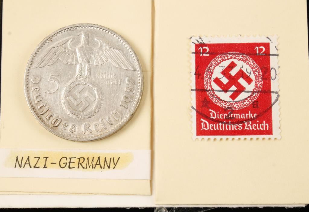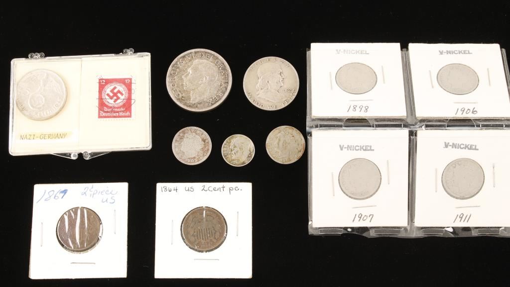 Including (1) Franklin half dollar, (6) "V" nickels, (2) U.S. 2 cent pieces, (1) Georgius Vi Dei Gratia Rex Canadian Dollar, (1) U.S. 1982 dime & (1) 1937 Nazi coin with stamp.