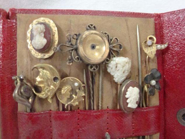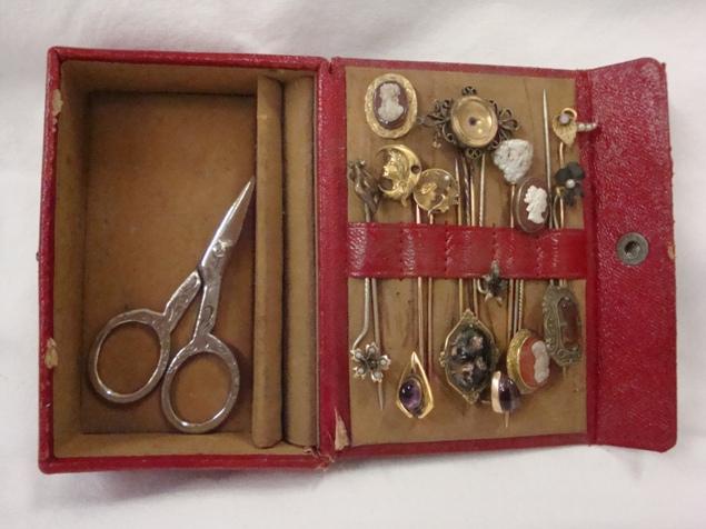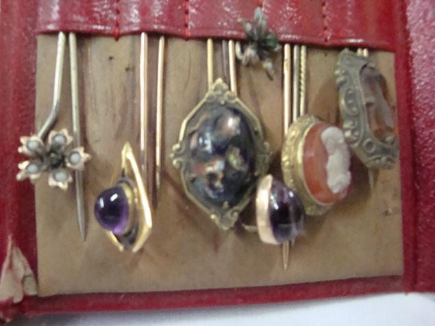 Interesting, useful lot of (15)different Victorian era stick pins in a small case.