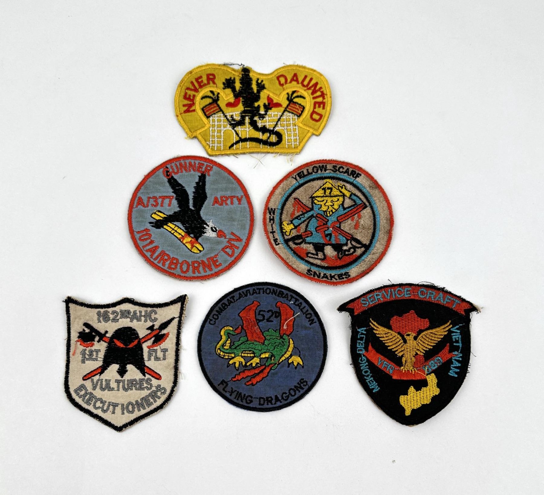 84th Engineer Never Daunted, 101st Airborne A/377 Gunner Artillery, Air Cavalry 7/17th Yellow Scarf White Snakes, 162nd Assault Helicopter Vultures Executioners Patch, 52nd Combat Aviation Battalion Flying Dragons, Mekong Delta Service Craft.