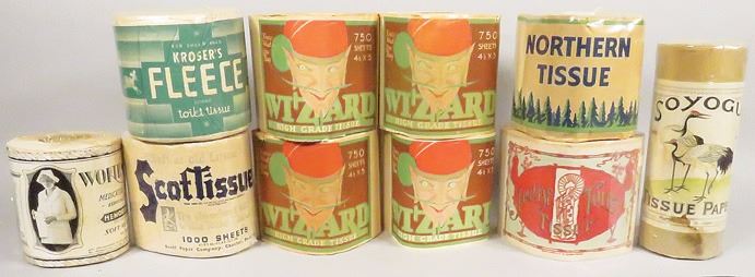 Collection of Vintage Toilet Tissue Rolls. Northern, Japanese, Kroger's Fleece, Soyogu, Worthman's, (4) Wizard and Scot.