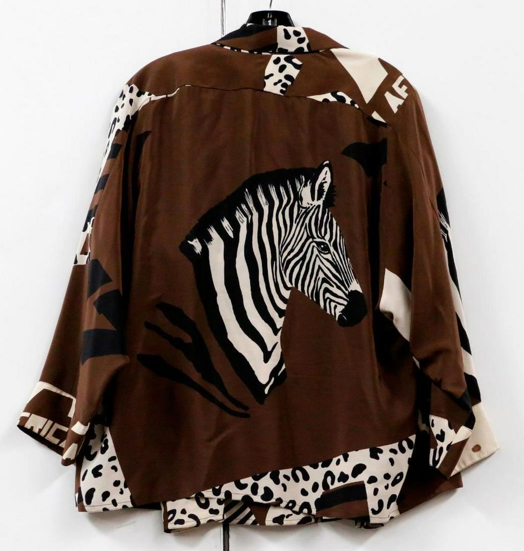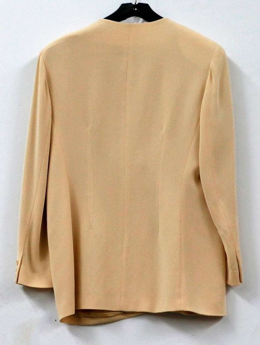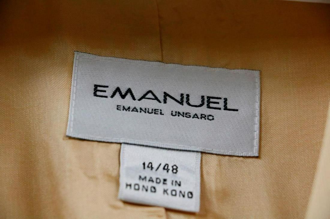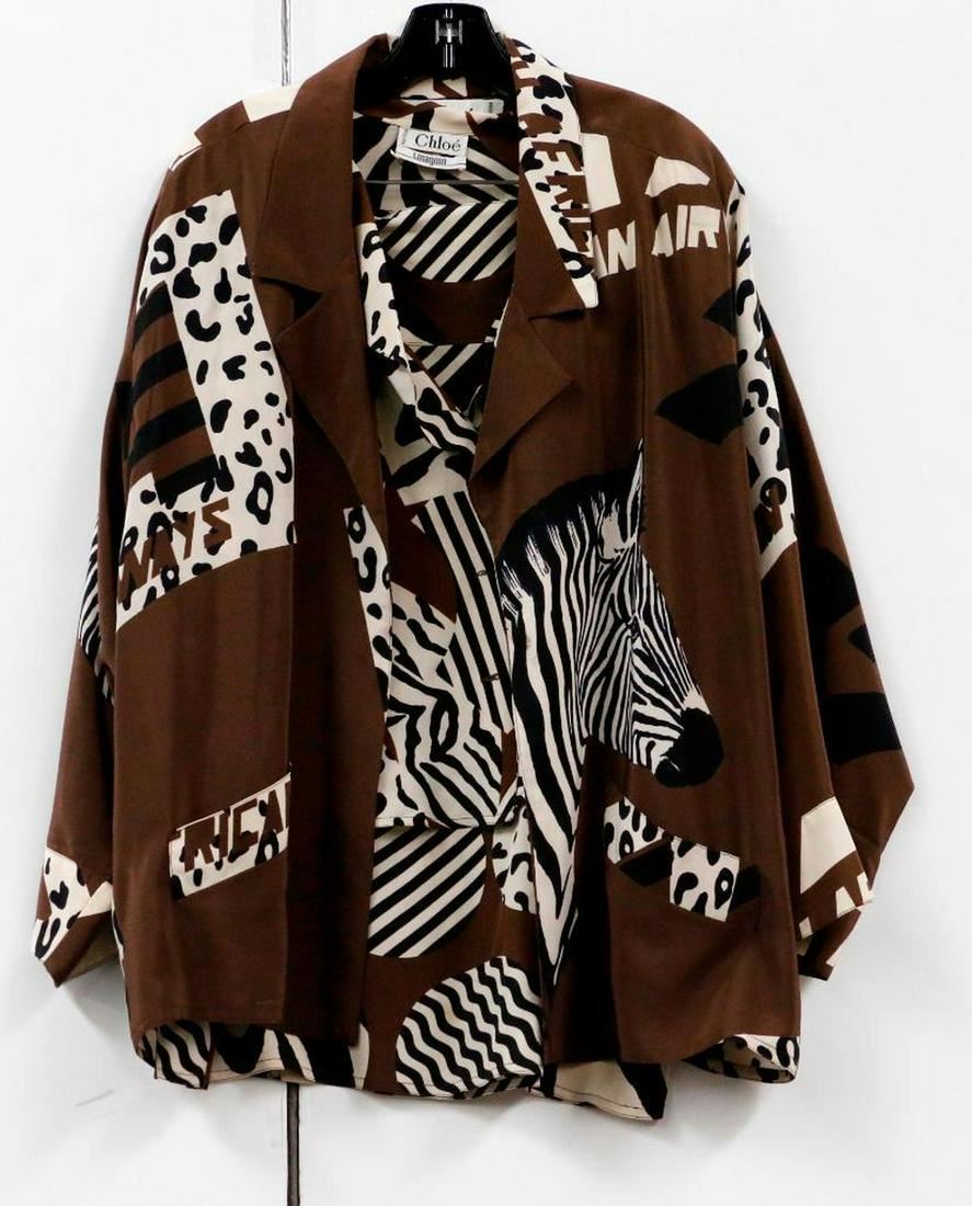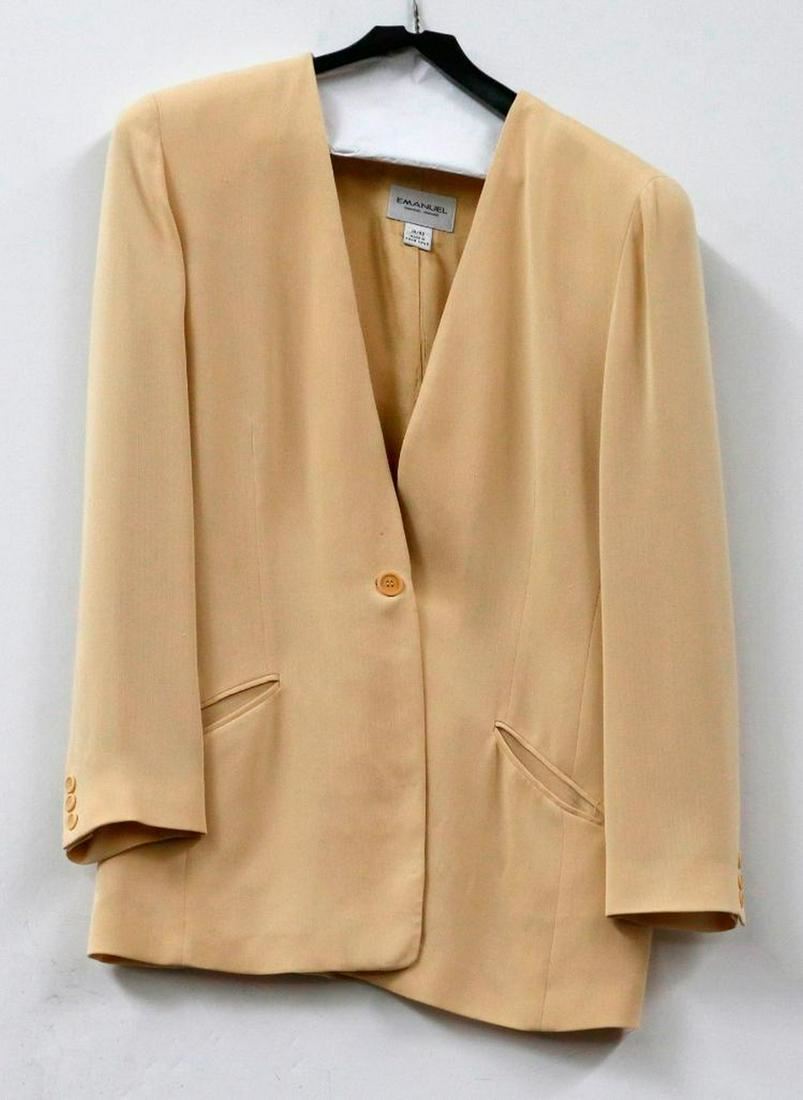 Including: Emanuel Ungaro beige blazer (sz 14/48) with pants (sz 12) Donna Karan NY Essentials black blazer, no size Chloe France silk safari motif 3-piece skirt set, no size Pink Tartan black & white wool belted cape, size LG Items are sold as is. Please inquire about condition if not otherwise stated.