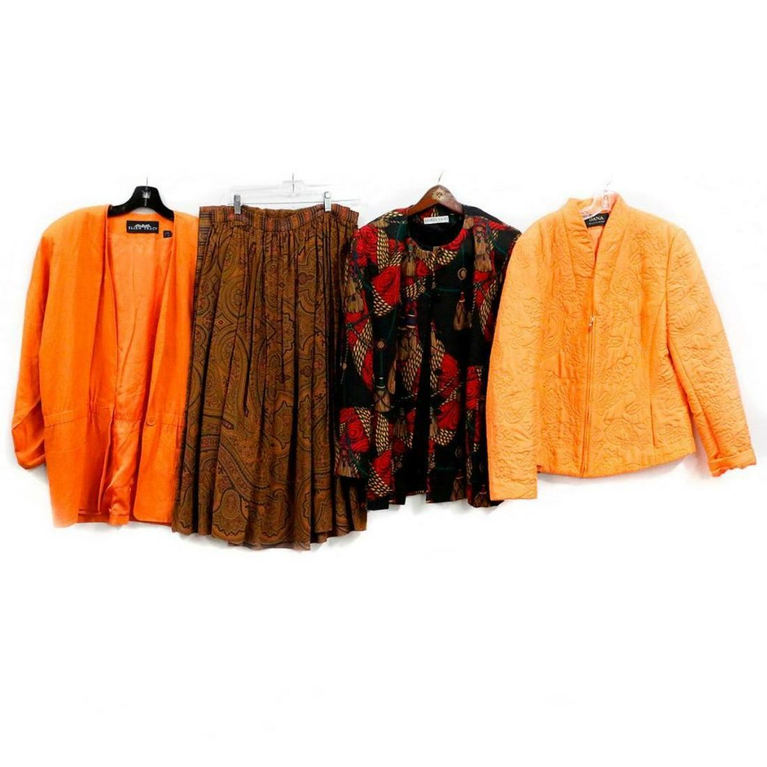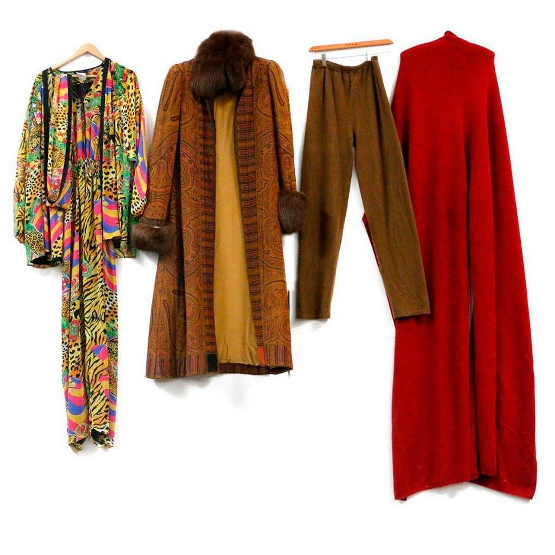 Including: Tse red wool shawl/cape Tse brown sweater pants, size L Gloria Sachs silk & fur jacket, skirt and scarf set, no size Gloria Sachs cashmere sweater (M) with matching blazer (sz 12) Diane Fres jumpsuit, jacket and scarf set, no size Dana Buchman quilted orange silk jacket, size 16 Linda Allard for Ellen Tracy orange linen jacket, size 12 Items are sold as is. Please inquire about condition if not otherwise stated.