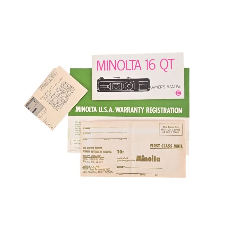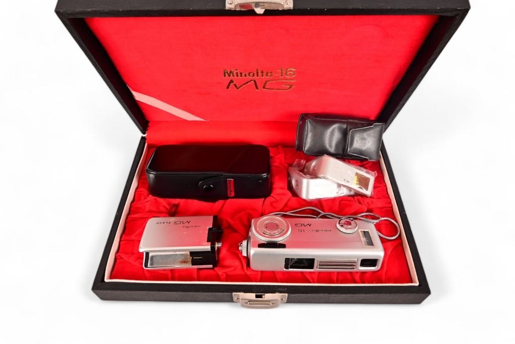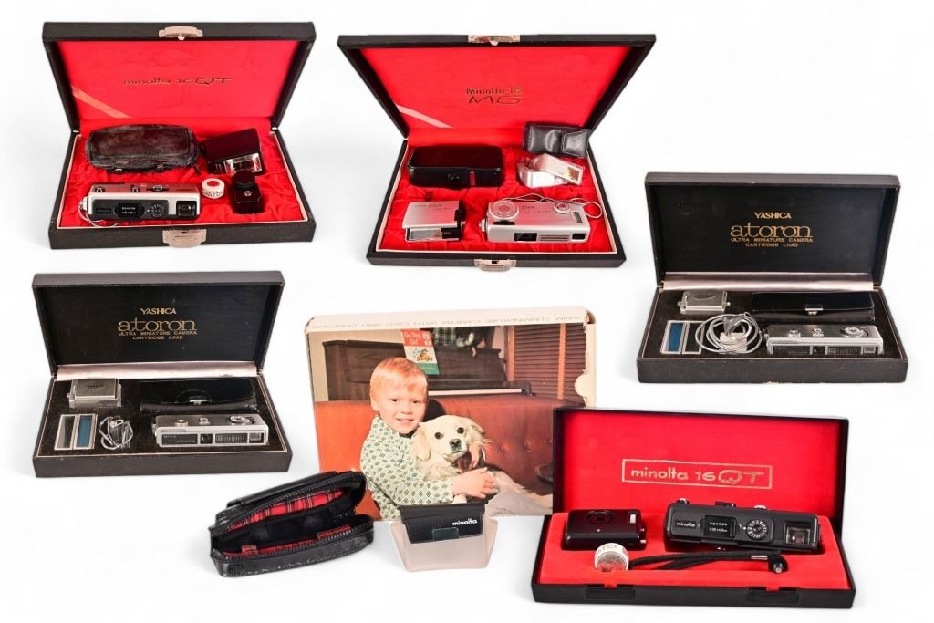 Collection of vintage 1960's Japanese subminiature cameras, NOS in original boxes. (2) Yashica Atoron; Minolta 16QT Cubegun Kit; Minolta 16QT and Minolta-16 MG