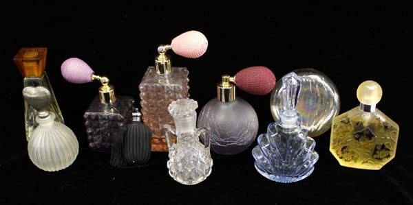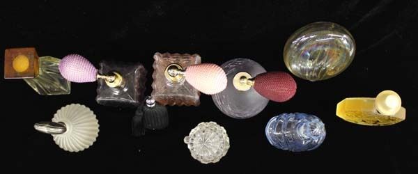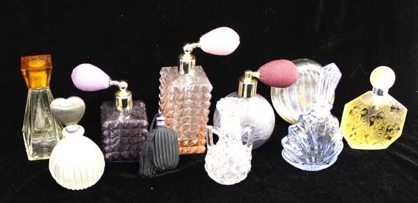 Collection of Antique/Vintage Perfume Bottles, largest measures 6''H, includes Blanchard, French J.C. Brosseau, International Silver Co. Refillable Bottle, Purple Cut Glass, Carved Black Glass, Hand Blown Iridescent, Blue Glass with Glass Stopper, Crystal Cut Glass with Glass Stopper, Pink Cut Glass, Alice-Aliya Purple Frosted and Crackled Cologne Perfume Refillable Bottle