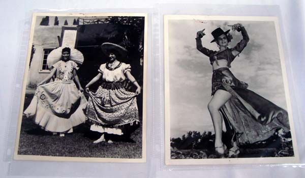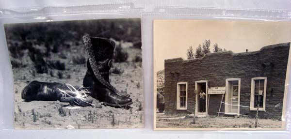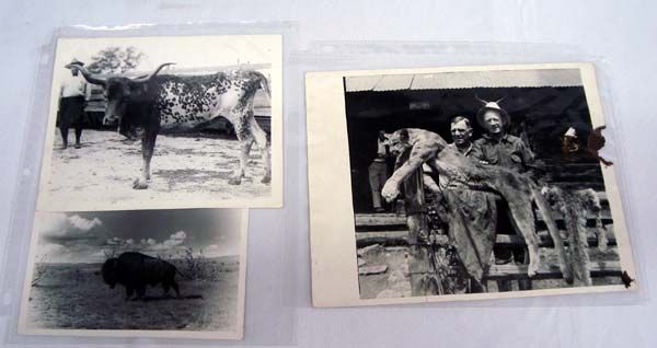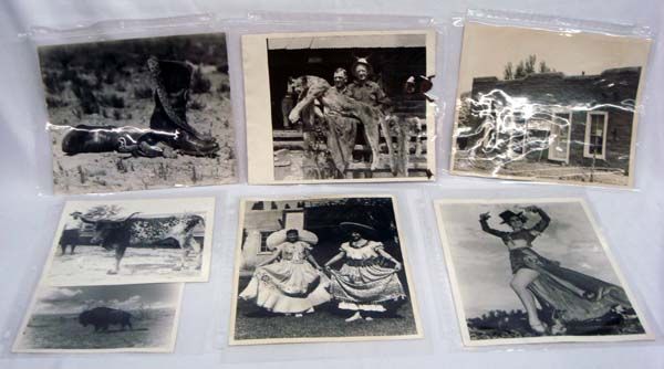 Collection of Vintage 7 Photos, #1 is a photo of a pair of cowboy boots with 2 rattlesnakes crawling in and out of them, #2 is a photo of an old adobe building (perhaps Lincoln NM) and shows a sign that reads ''Billy Kid carved his initials on door frame while prisoner here in 1876'', on back it credits the photo to the NM State Tourist Bureau #58,041 and there is also typed written provenance as to what the photo is depicting, #3 is a photo of 2 men holding a deceased mountain lion propped up on a fence post, on back reads ''Aultman Photo Co. 202 San Francisco El Paso, Texas'', there is a damaged place on the one side of the picture, #4 is a photo of 2 women in embroidered Mexican dance costumes on and one is wearing a sombrero, on the back credits photo to the NM State Tourism Bureau, and reads ''No. 47,592 Dancing Girls before a stagecoach. Santa Fe Fiesta, held in Santa Fe, New Mexico every year during the Labor Day weekend'', #5 is a photo of a woman dressed up in a flamenco costume wearing a bolero hat and jacket, stamped on back credits photo to the New Mexico State Tourist Bureau No. 47974, #6 is a photo of a longhorn with an old cowboy in the the background, on back reads ''Cows head in 3 3/4'' circle with horns out'' and #7 is a photo of a buffalo out on the range, on back reads ''Buffalo on Reynolds Ranch #9 Desert Art Shop 102 E. San Antonio St. El Paso Texas Aug. 24, 1939''