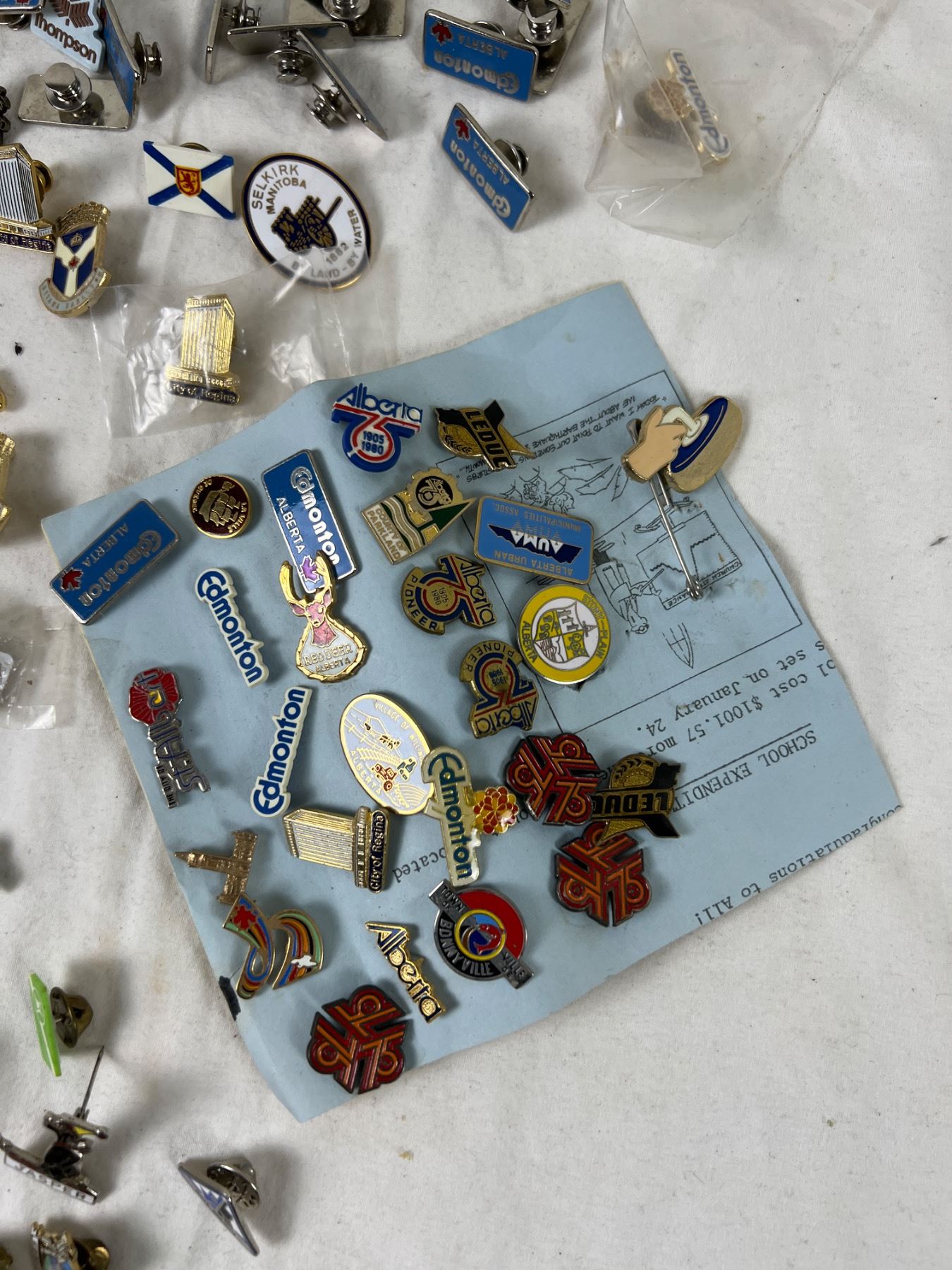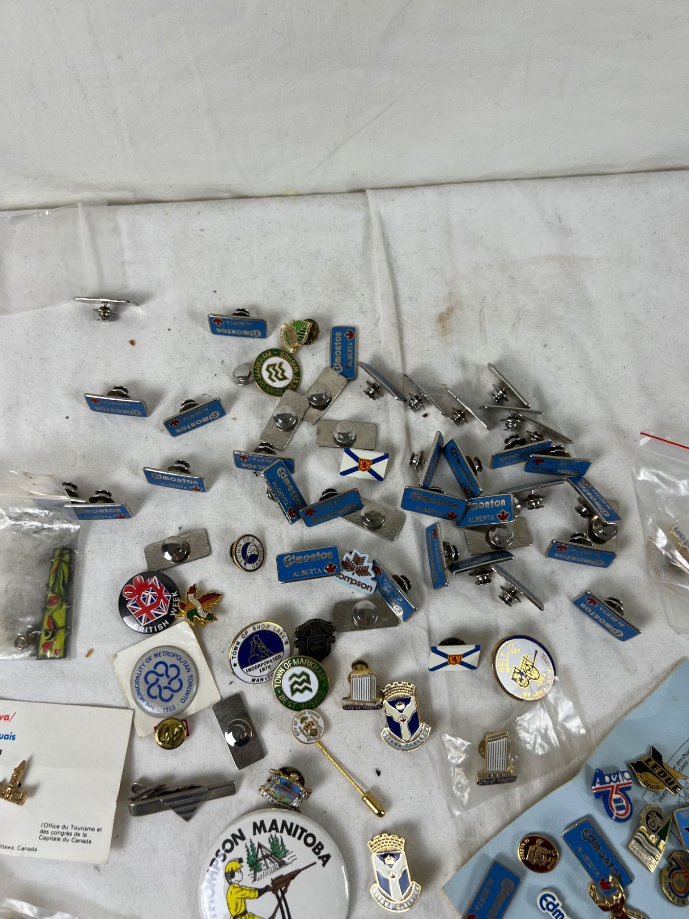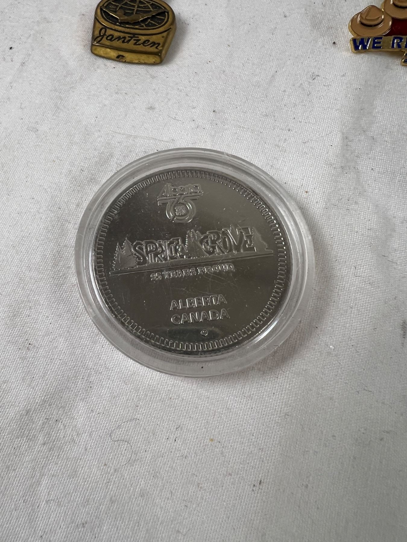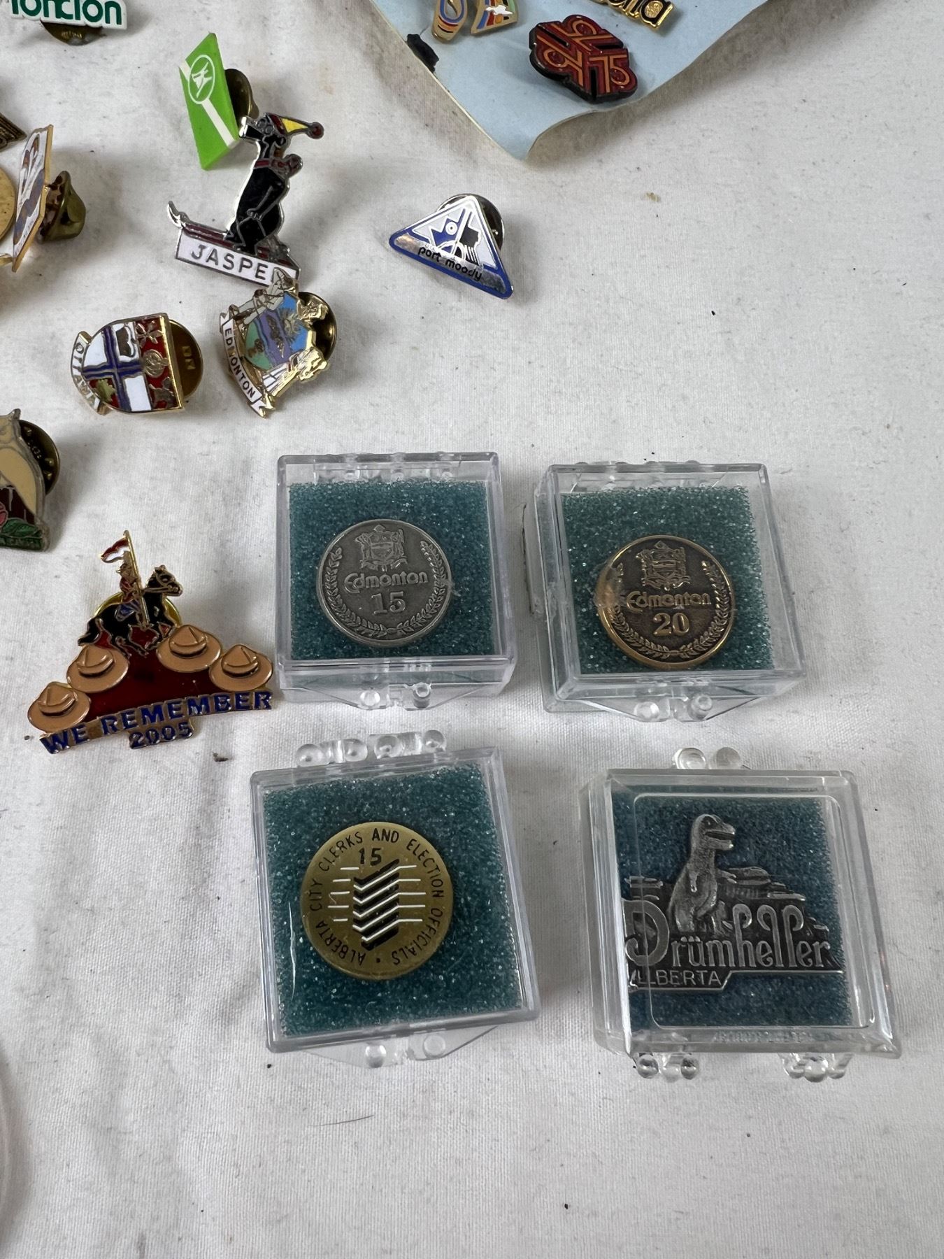 Variety of pins from many different parts of Alberta. Also includes a Spruce Grove Trade Dollar