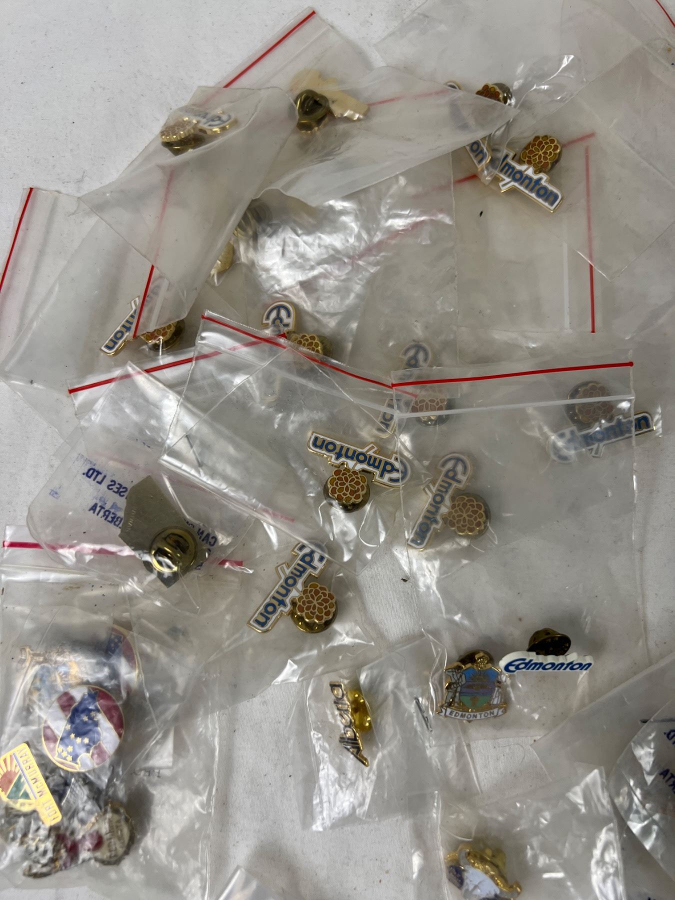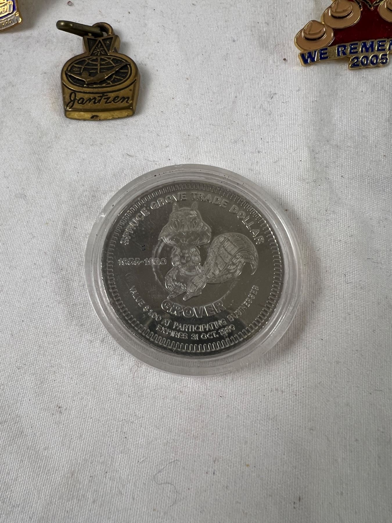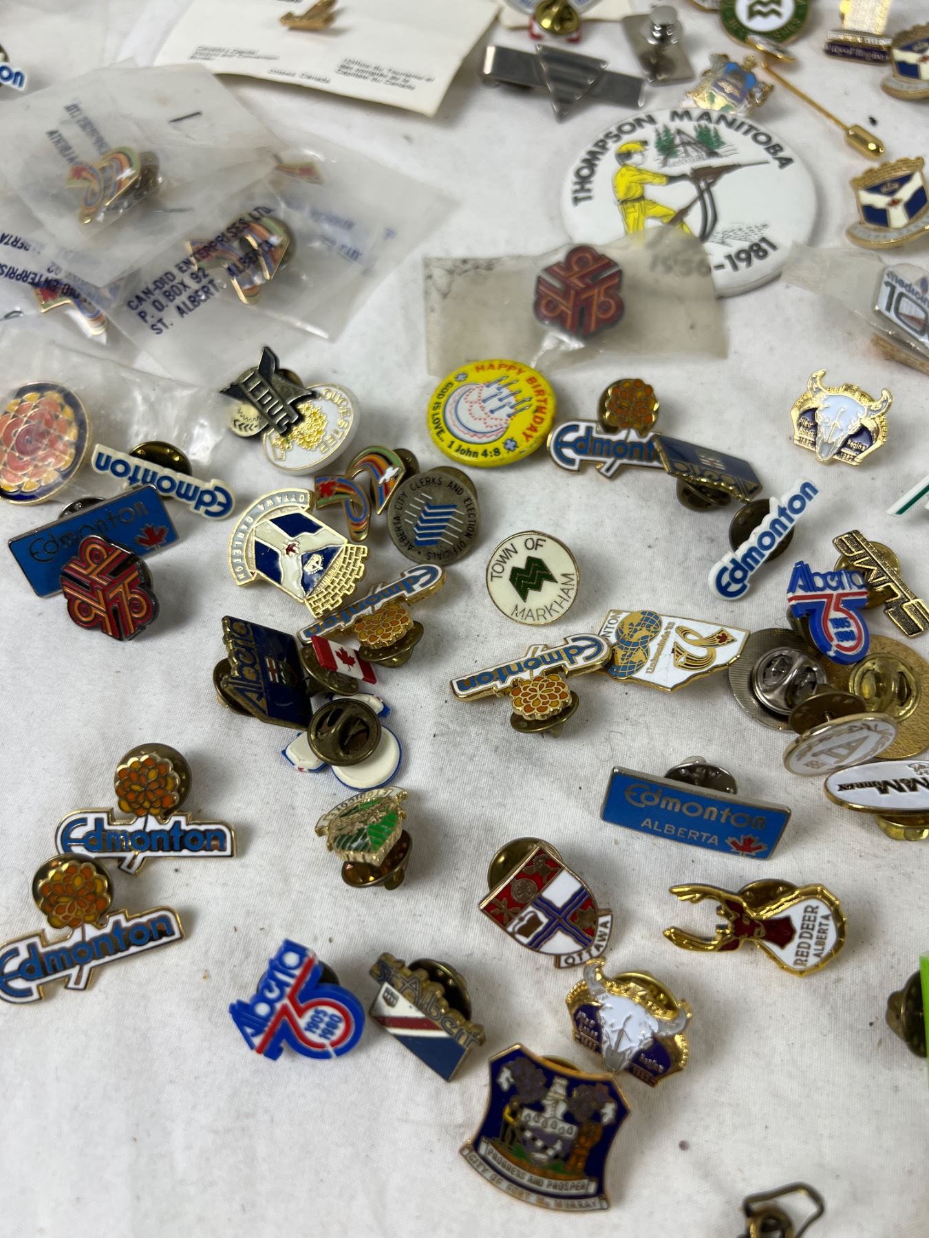Variety of pins from many different parts of Alberta. Also includes a Spruce Grove Trade Dollar