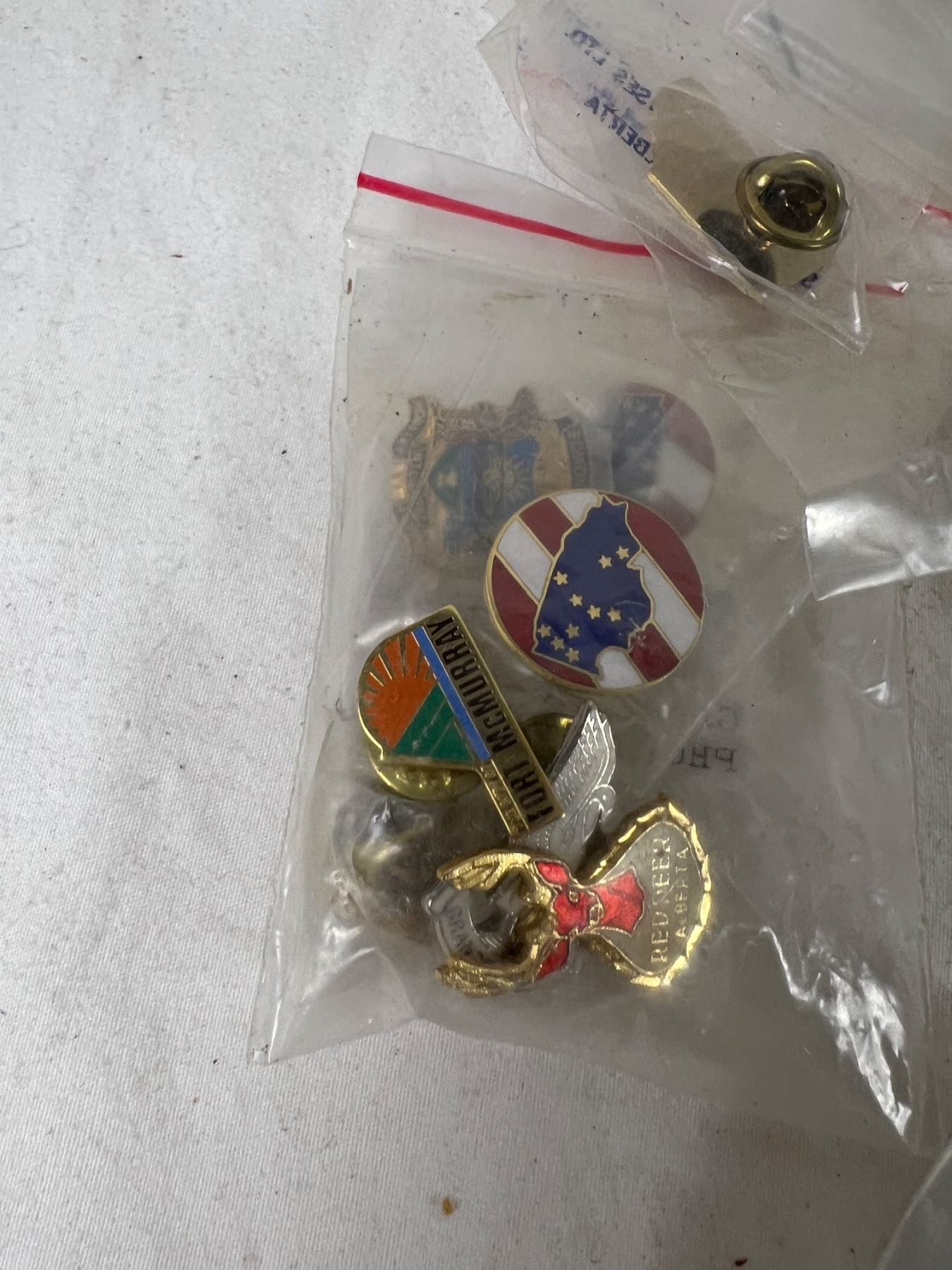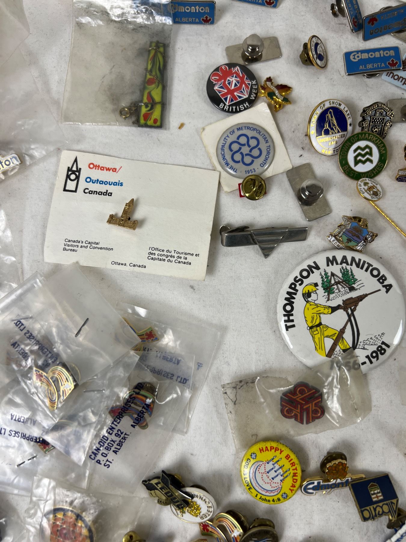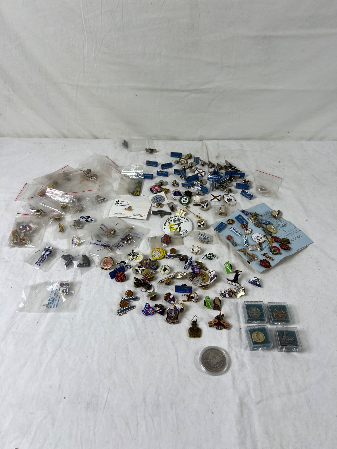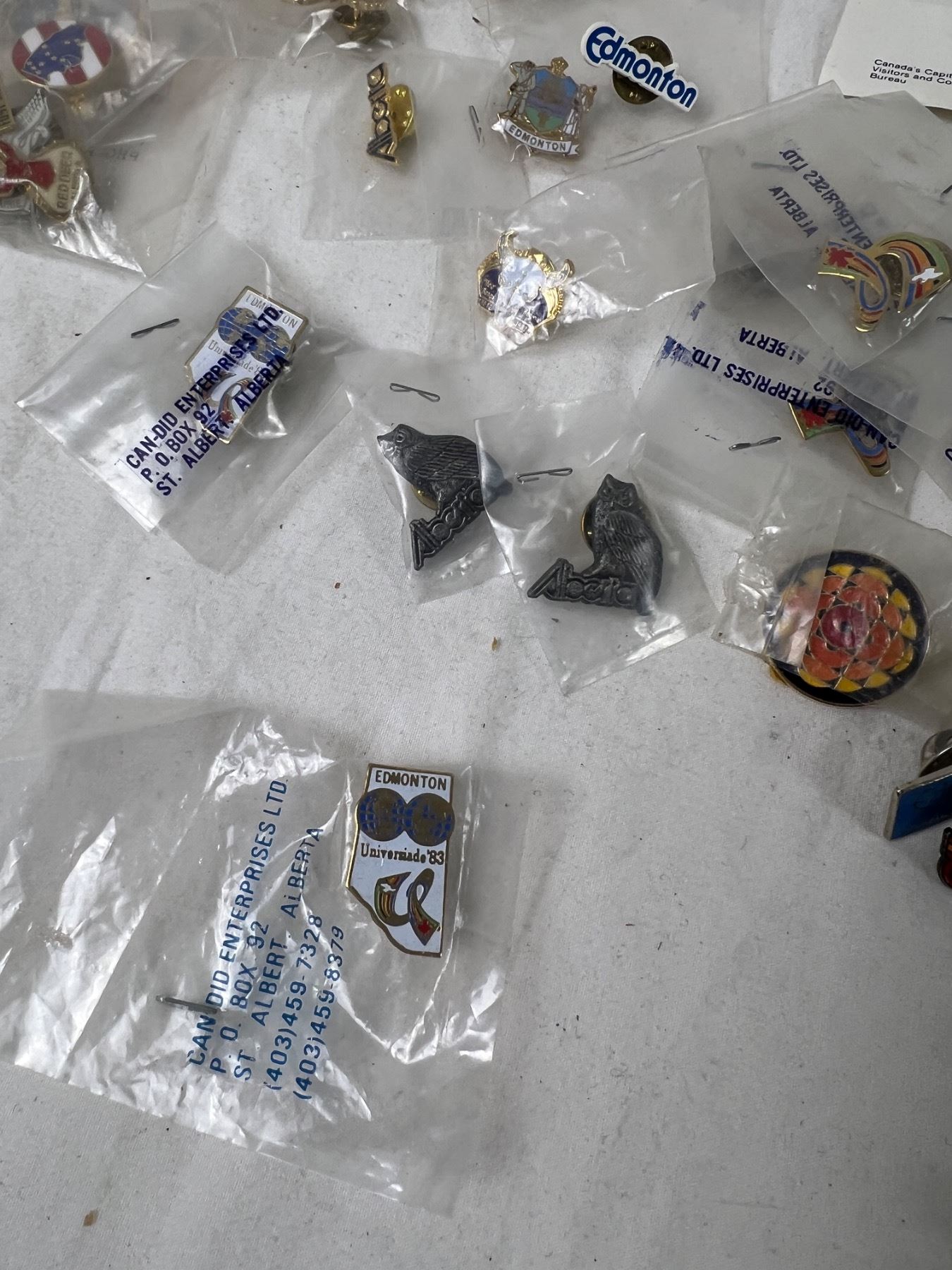 Variety of pins from many different parts of Alberta. Also includes a Spruce Grove Trade Dollar