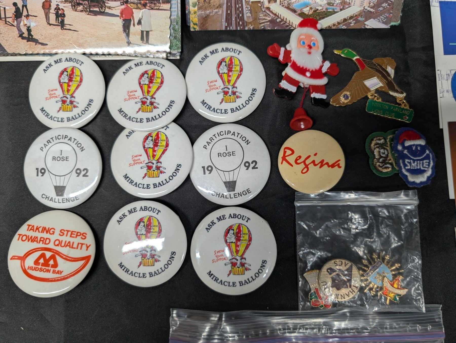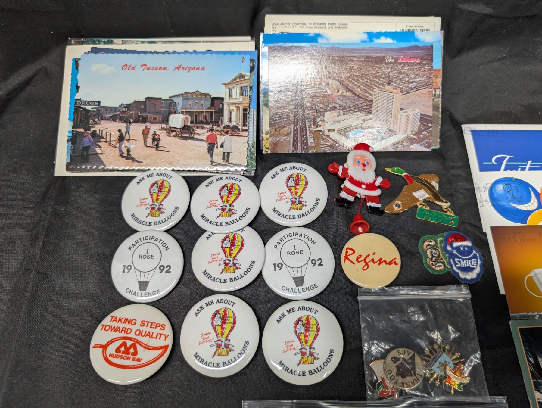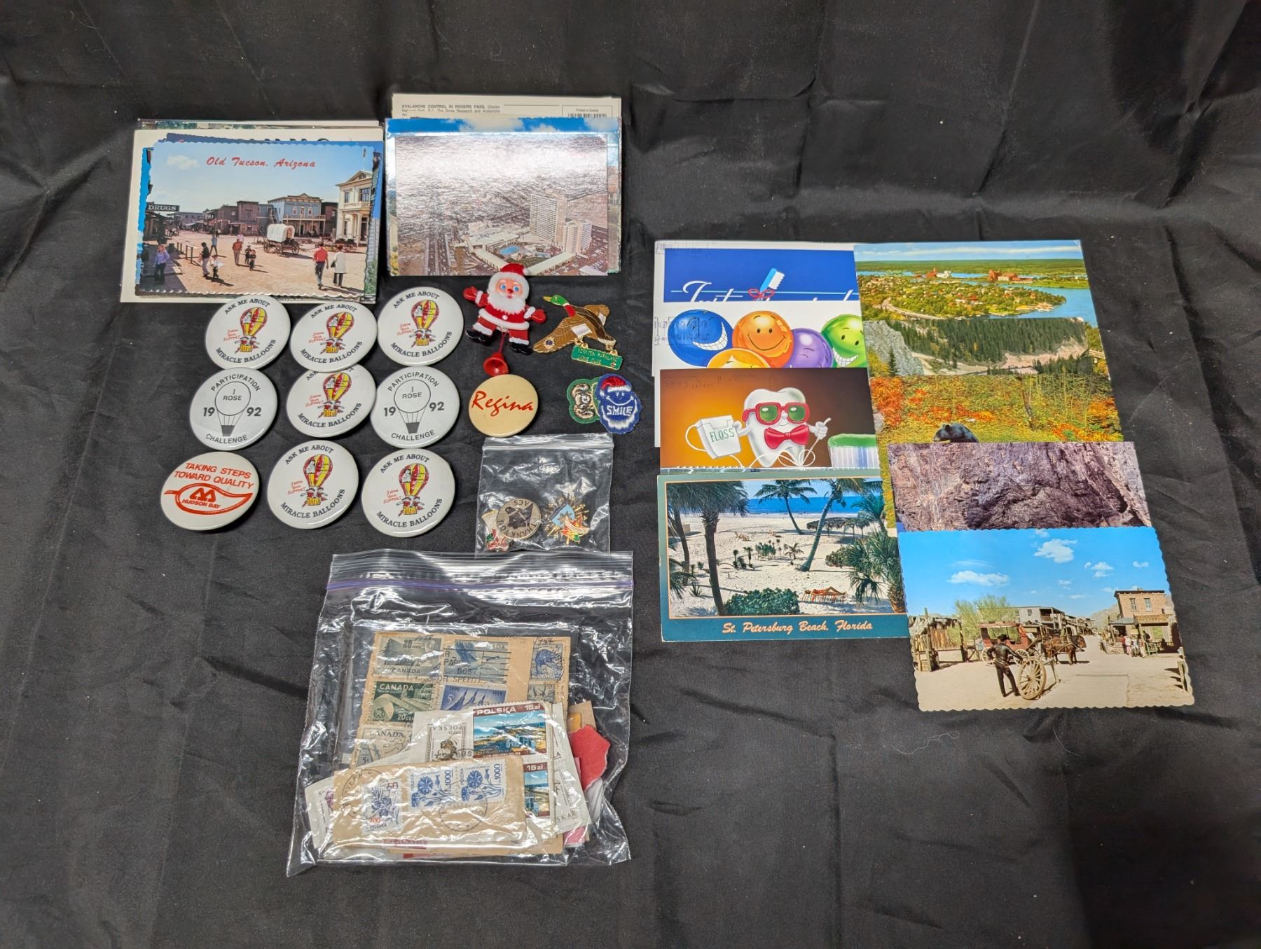 Collection of Vintage Post Cards (USED), Stamps, and pins