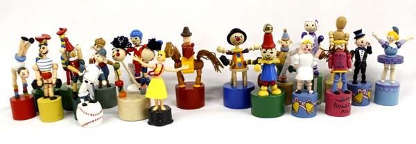 Hummert Estate: Collection of Vintage Wooden Push Puppets, includes athletes, clowns, bride & groom, hippie, ballerina, Pinnochio, and cowboy, all are wood with the exception of the plastic hula dancer, largest measures 5.75''h, most are made by Detoa and Petra in the Czech Republic, 20 pieces in all
