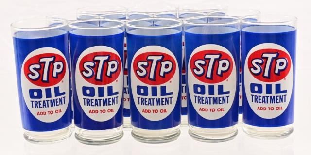STP Oil Treatment Large Display Coin Bank, 10 1/2" x 18". Set of (12) Collector STP Glasses. STP Porcelain on cast iron sign, 4" x 5 1/2".