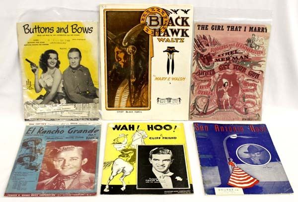 Collection of Vintage Sheet Music, includes: 1. Alla' en El Rancho Grande, Mexican Cowboy Song, Edwards B. Marks Music Corp. c. 1934 2. Wah! Hoo! by Cliff Friend, Crawford Music Corporation, c. 1936 3. San Antonio Rose by Bob Wills, Bourne Co. Music Publishers, c. 1940 (top page is separated from other pages) 4. The Girl That I Marry by Irving Berlin Music Company, c. 1946 5. Buttons and Bows by Jay Livingston and Ray Evans, Famous Music Corp., c. 1947 6. The Black Hawk Waltz by Mary E. Walsh by De Luxe Music Co., all 3 pages are separated