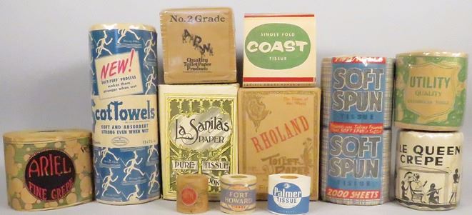 Collection of Vintage Toilet Tissue & Paper Towels including sample rolls. 12 rolls and packs.